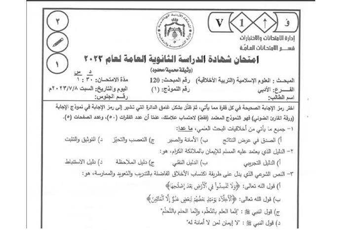 الوكيل الاخباري- نشرت وزارة التربية والتعليم نموذج أسئلة امتحان مبحث العلوم الإسلامية للتوجيهي الدورة الصيفية بحسب رصد "الوكيل الإخباري" للفرع الادبي.