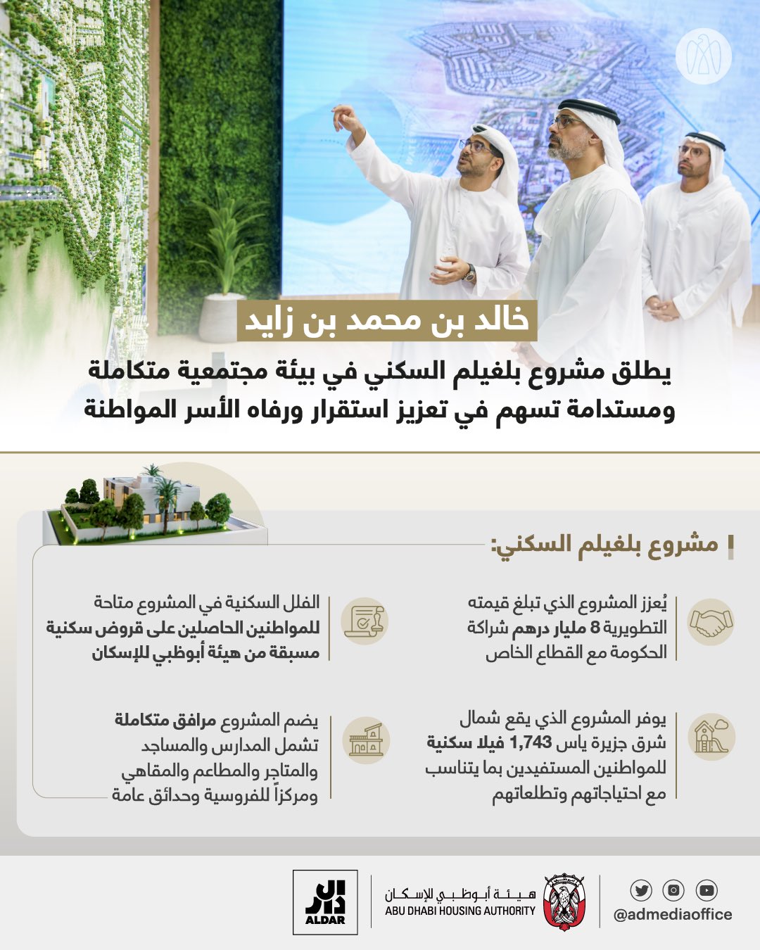 خالد بن محمد بن زايد يطلق مشروع بلغيلم السكني المتكامل، الذي تشرف شركة الدار العقارية على تطويره بقيمة تبلغ 8 مليار درهم. ويوفر المشروع، الذي سيتم الانتهاء منه عام 2026، 1,743 فيلا سكنية للمواطنين الحاصلين على قروض سكنية من هيئة أبوظبي للإسكان، وسيتم الانتهاء منه عام 2026