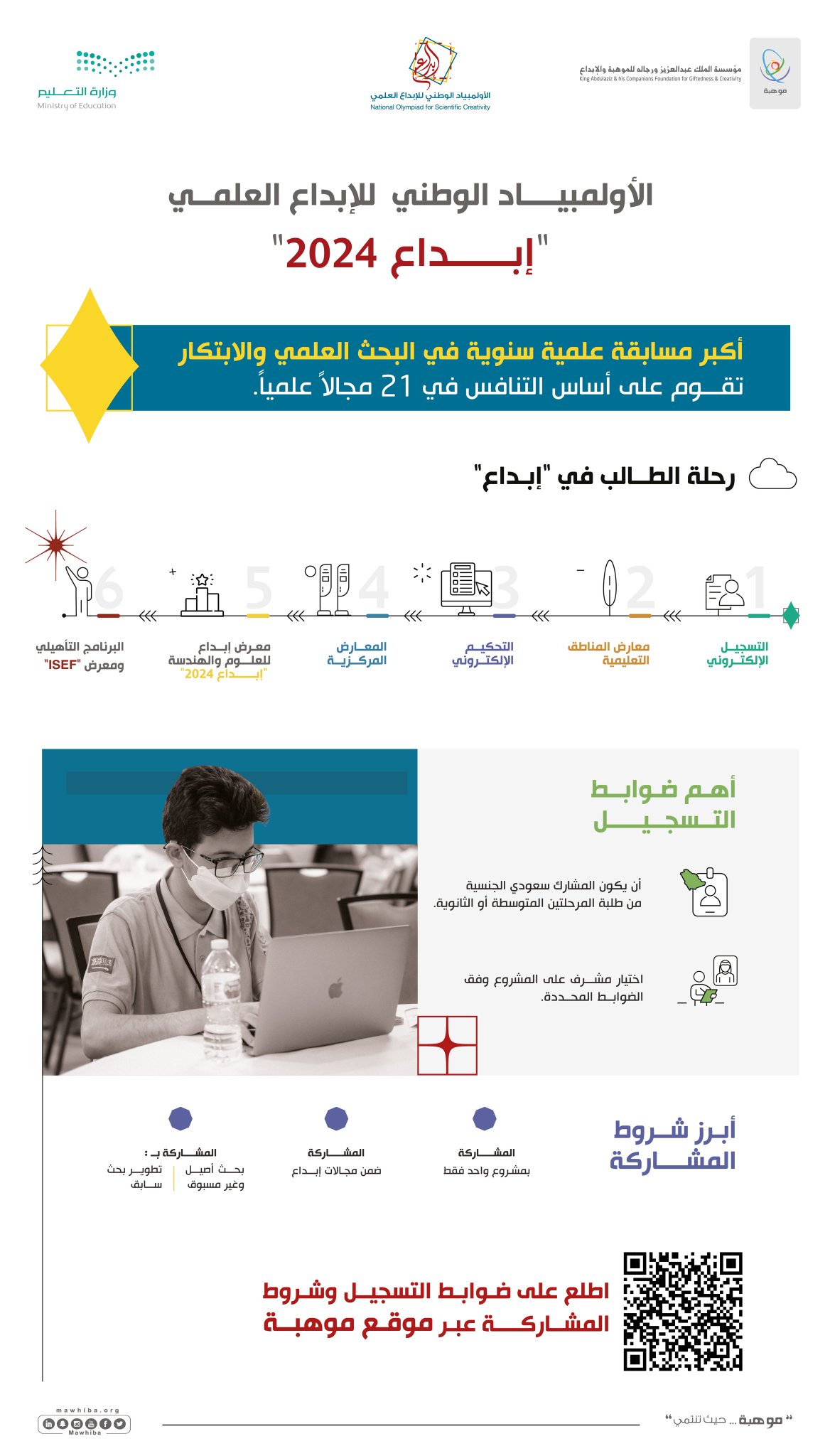 أعلنت مؤسسة الملك عبدالعزيز ورجاله للموهبة والإبداع "موهبة"، بالشراكة مع وزارة التعليم، فتح باب التسجيل للطلاب والطالبات السعوديين في المرحلتين المتوسطة والثانوية في الأولمبياد الوطني للإبداع العلمي "إبداع 2024"، ويستمر حتى الـ26 من سبتمبر القادم؛ مؤكدة اشتراط أن يكون للمتقدم مشروع علمي واحد ضمن 21 مجالًا ذي أولوية وطنية
