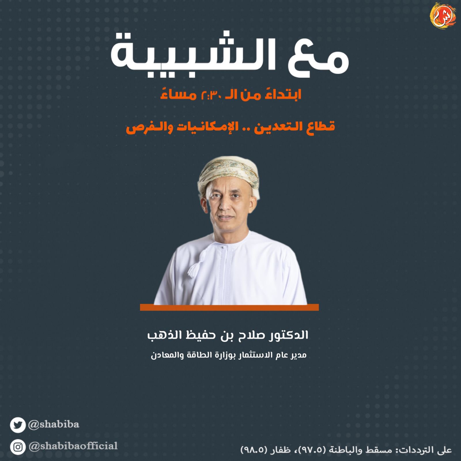 "قطاع التعدين.. الإمكانيات والفرص" موضوع حلقة اليوم من برنامج مع الشبيبة الساعة 2:30 مساءً مع عبدالله السعيدي وضيفه: الدكتور صلاح بن حفيظ الذهب. مدير عام الاستثمار بوزارة الطاقة والمعادن