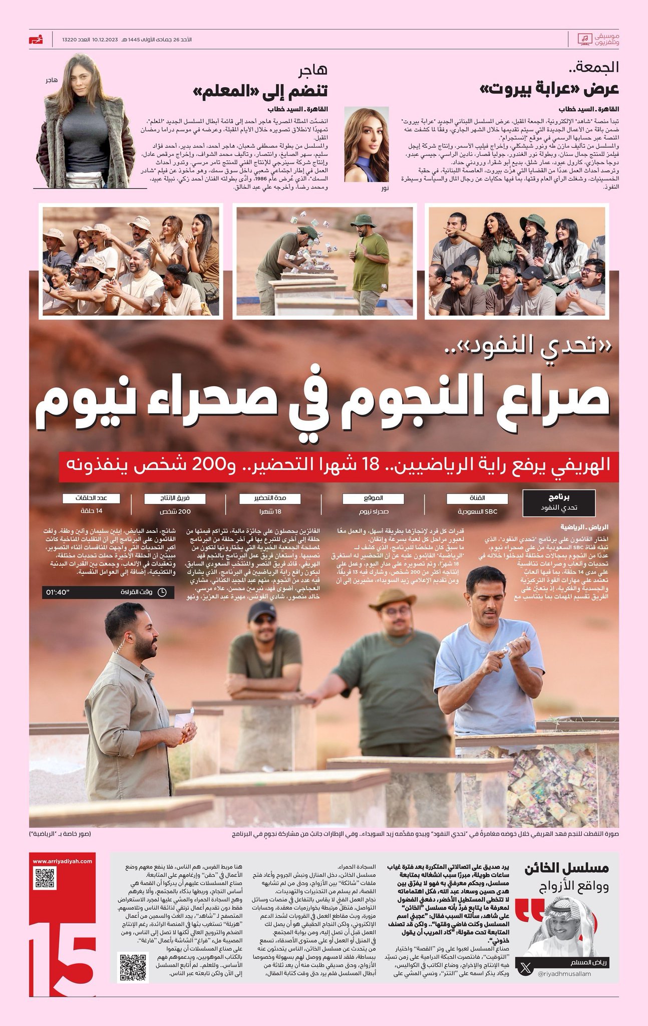 ما سبق كان ملخصًا للبرنامج، الذي كشف لـ الرياضية القائمون عليه عن أن التحضير له استغرق 18 شهرًا، وتمَّ تصويره على مدار اليوم، وعمل على إنتاجه أكثر من 200 شخص، وشارك فيه 13 فريقًا، ومن تقديم الإعلامي زيد السويداء، مشيرين إلى أن الفائزين يحصلون على جائزة مالية، تتراكم قيمتها من حلقة إلى.....