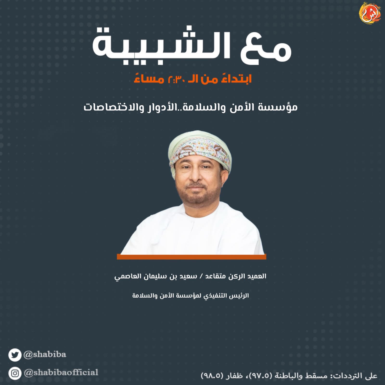 مؤسسة الأمن والسلامة.. الأدوار والاختصاصات. موضوع حلقة اليوم من برنامج مع الشبيبة الساعة 2:30 مساءً مع عبدالله السعيدي وضيفه: العميد ركن متقاعد / سعيد بن سليمان العاصمي - الرئيس التنفيذي لمؤسسة الأمن والسلامة