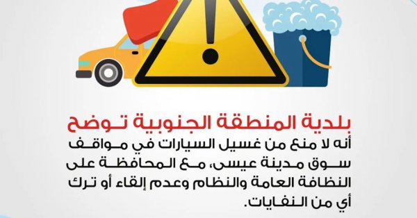بلدية المنطقة الجنوبية توضح أنه لا منع من غسيل السيارات في مواقف سوق مدينة عيسى، مع المحافظة على النظافة العامة والنظام وعدم إلقاء أو ترك أي من النفايات.