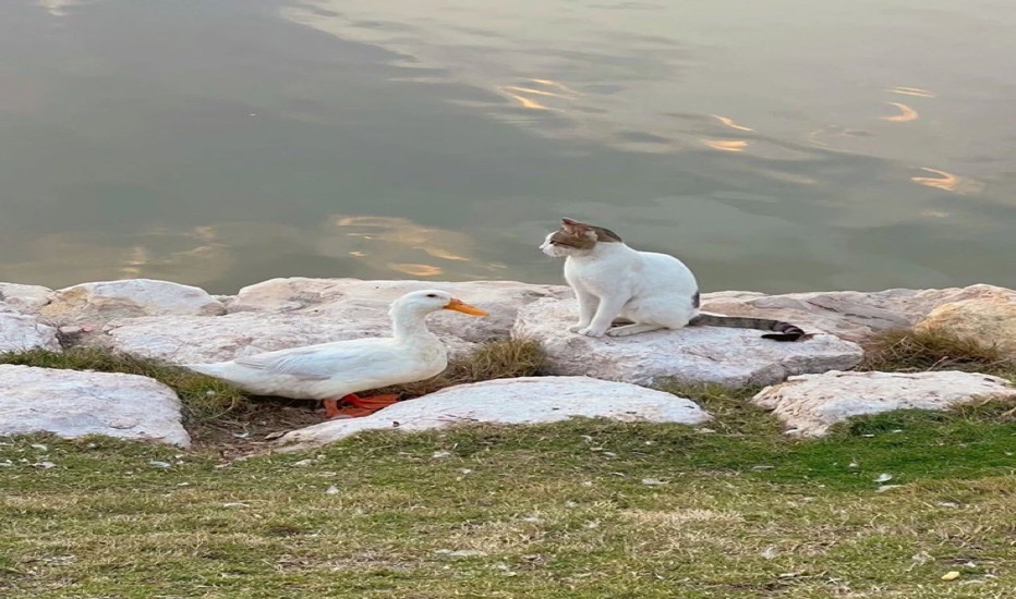 في بحيرة البط بكورنيش الخبر يقضي قط وبطة أوقاتاً سعيدة، يلهوان سوياً ويتعانقان وينثران أجواءً من البهجة ويمنحان البسمة لزوار الكونيش.