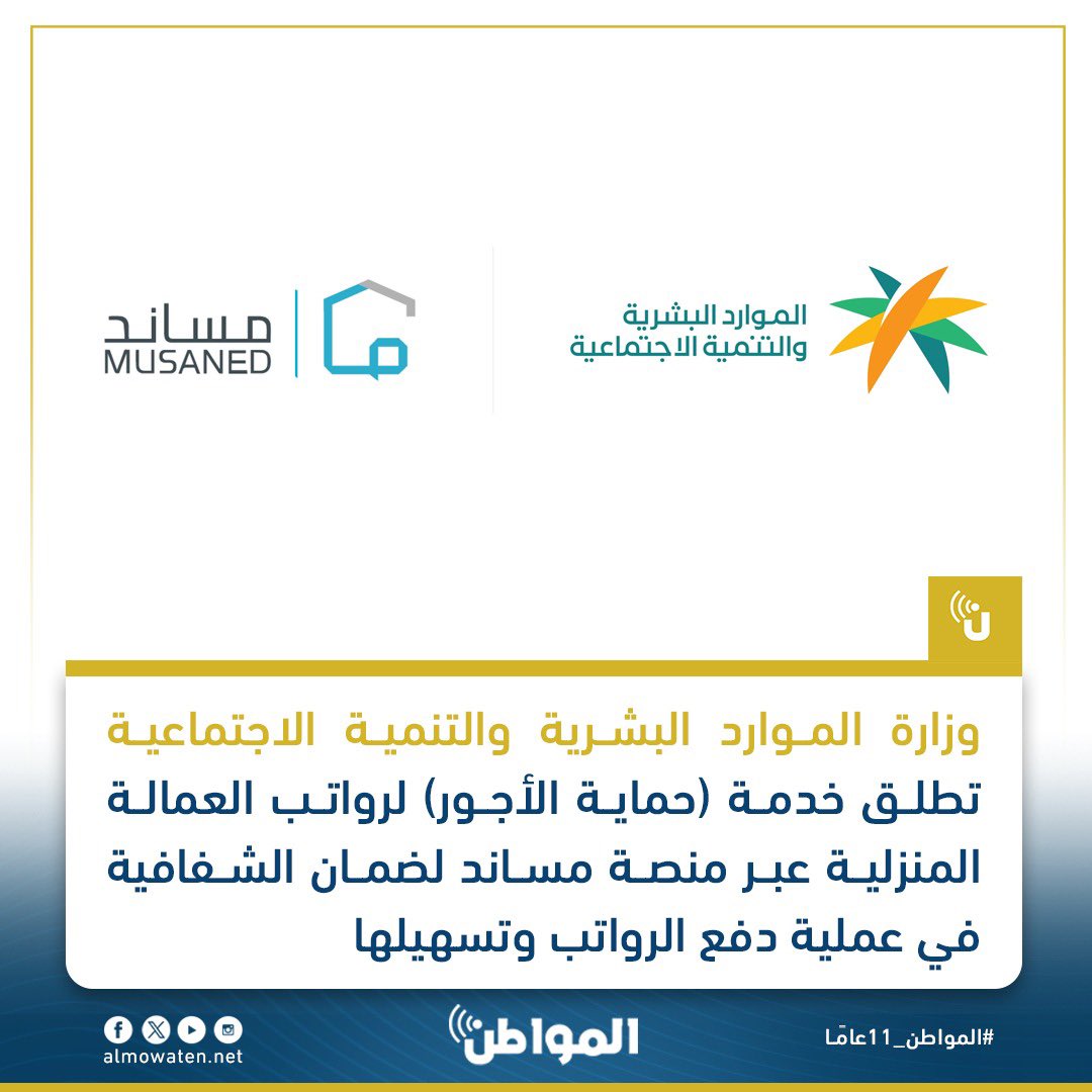 وزارة الموارد البشرية والتنمية الاجتماعية تطلق خدمة (حماية الأجور) لرواتب العمالة المنزلية عبر منصة مساند لضمان الشفافية في عملية دفع الرواتب وتسهيلها #السعودية