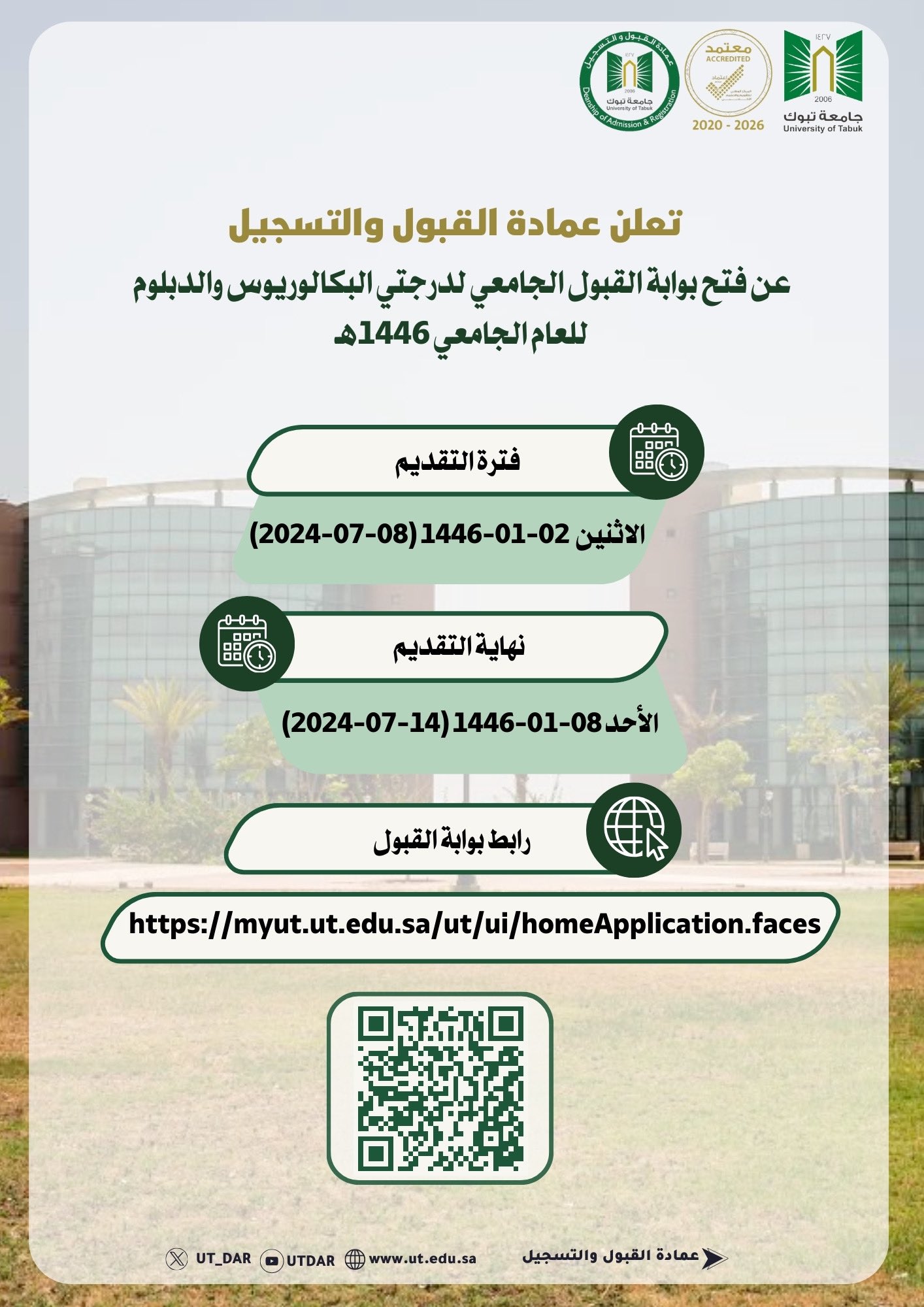 تعلن عمادة القبول والتسجيل دليل القبول لدرجتي البكالوريوس والدبلوم التأهيلي للعام الجامعي القادم 1445هـ