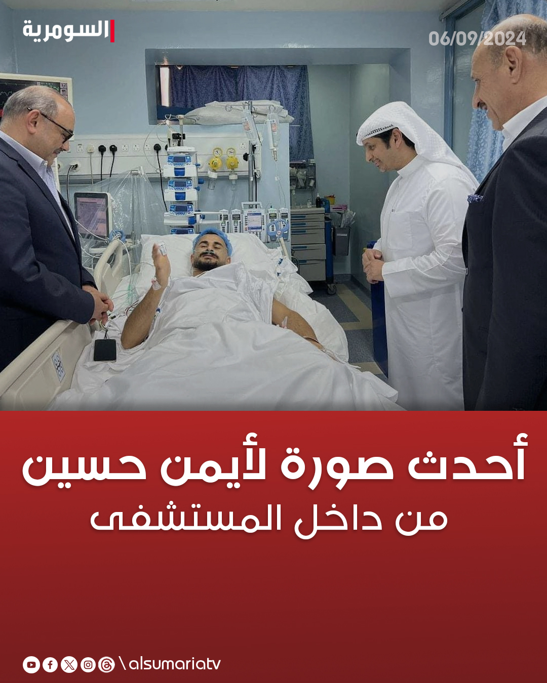 نشرت وسائل إعلامية وناشطون على التواصل الاجتماعي، صورة جديدة لمهاجم المنتخب الوطني العراقي ايمن حسين من داخل مستشفى الشفاء في الكويت. جاء ذلك بعدما أكد عضو الاتحاد العراقي لكرة القدم الناطق الرسميّ "أحمد الموسوي" نائب رئيس الوفد العراقيّ المتواجد في البصرةِ، تحسن حالة اللاعب "أيمن حسين" واستقرارها بعد تعرضه لإصابةٍ قويةٍ في بدايةِ مباراة الأمس، نقل على إثرها إلى المستشفى في البصرة بعد نهايةِ مباراة العراق وعُمان.