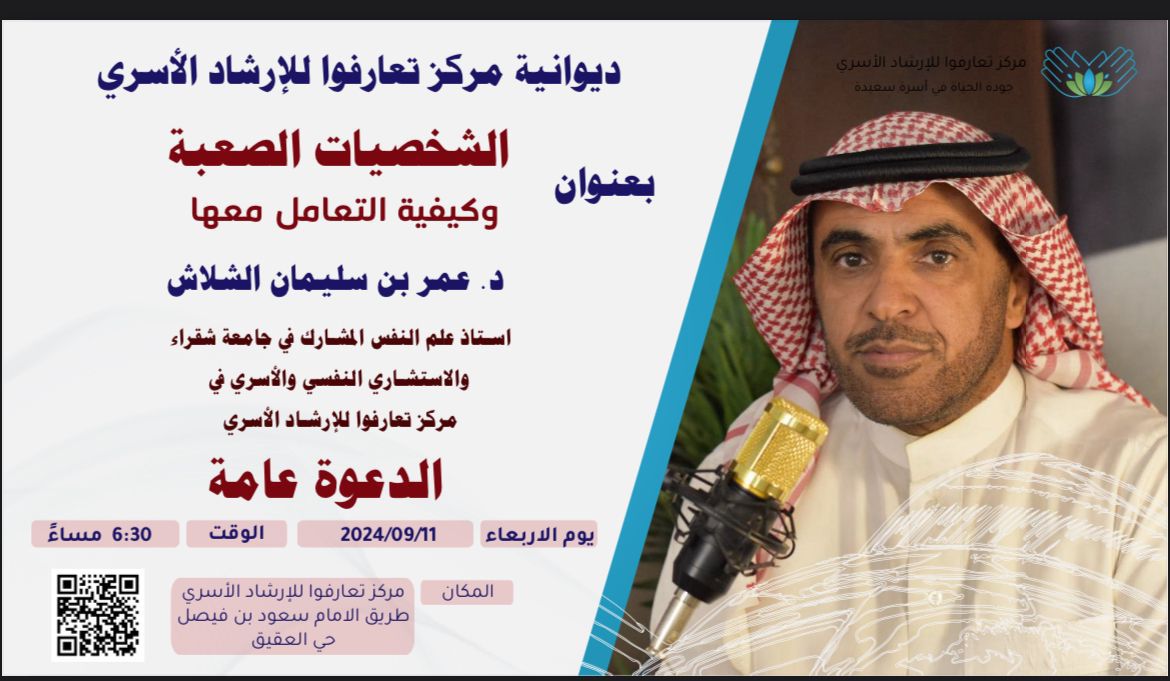 تستضيف ديوانية مركز تعارفوا للإرشاد الأسري الدكتور عمر بن سليمان الشلاش أستاذ علم النفس المشارك في جامعة شقراء للحديث عن الشخصيات الصعبة، وذلك ضمن جهود المركز التوعوي والتثقيفي وزيادة المعرفة لدى الأسرة والمجتمع.