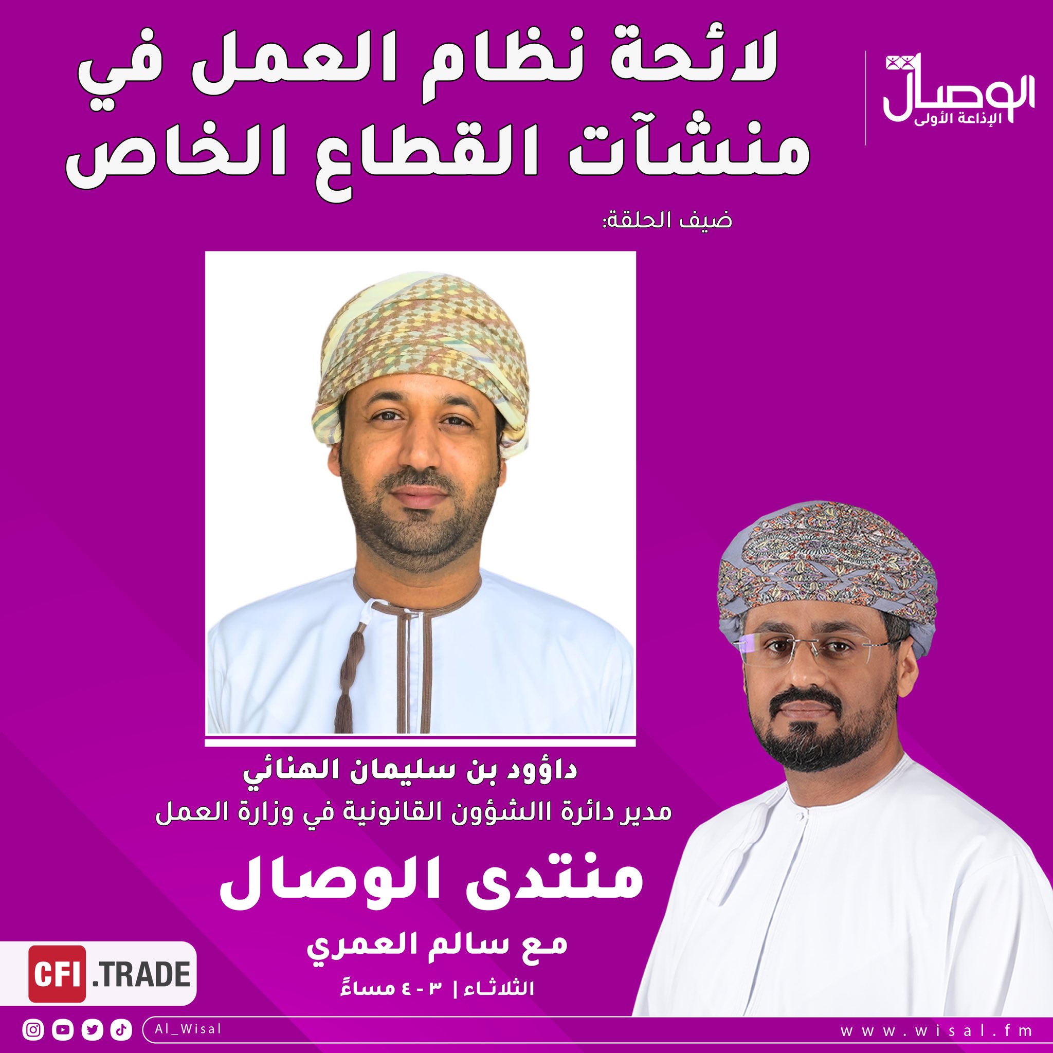 الوصال| "لائحة نظام العمل في منشآت القطاع الخاص". عنوان حلقة اليوم من برنامج منتدى الوصال مع سالم العمري وضيفه مدير دائرة الشؤون القانونية في. وإعداد| عبدالوهاب المجيني