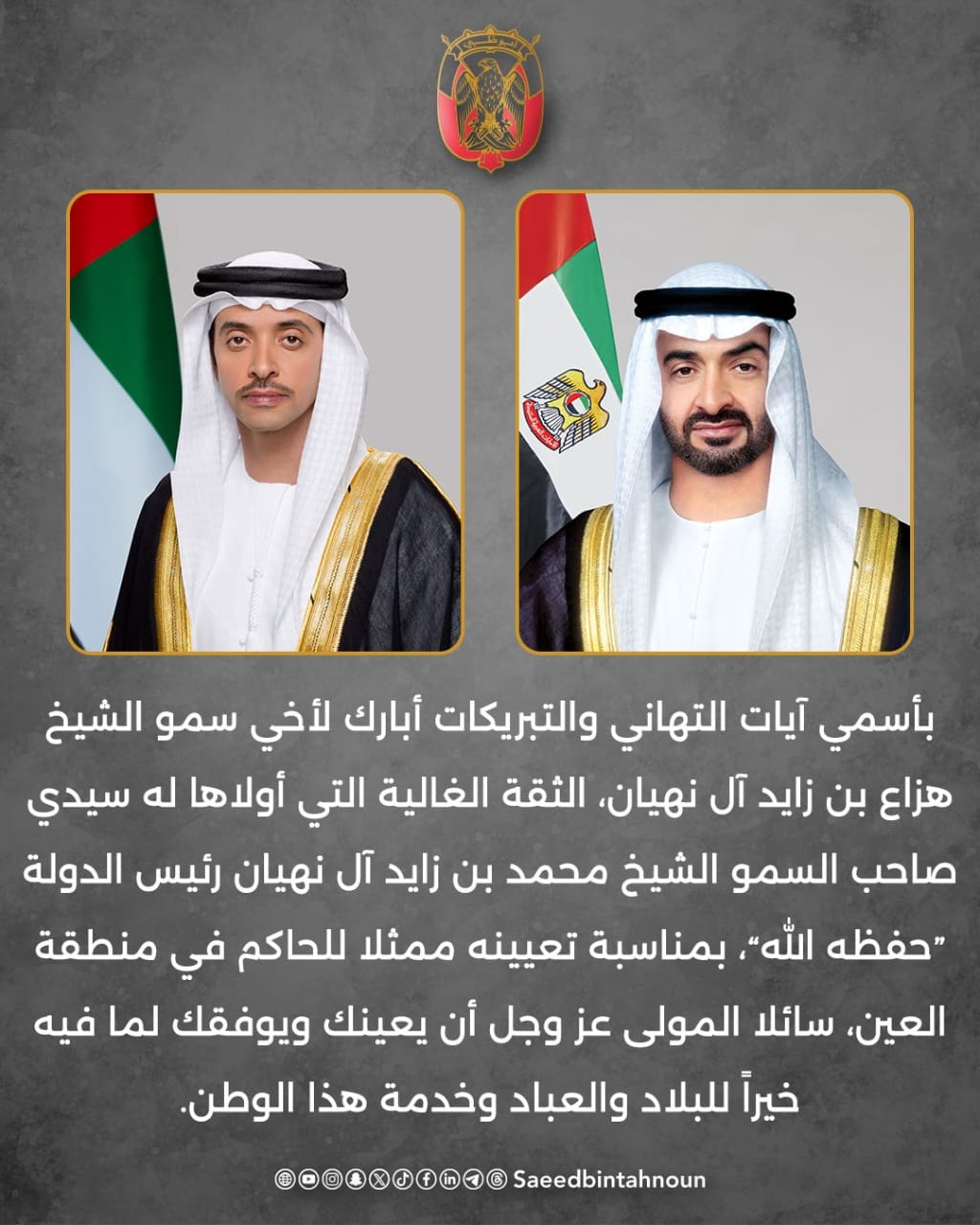 سعيد بن طحنون آل نهيان : بأسمى آيات التهاني والتبريكات أبارك لأخي سمو الشيخ هزاع بن زايد آل نهيان، الثقة الغالية التي أولاها له سيدي صاحب السمو الشيخ محمد بن زايد آل نهيان رئيس الدولة «حفظه الله»، بمناسبة تعيينه ممثلاً للحاكم في منطقة العين، سائلاً المولى عز وجل أن يعينك ويوفقك لما فيه خير البلاد والعباد وخدمة هذا الوطن #صحيفة_الخليج