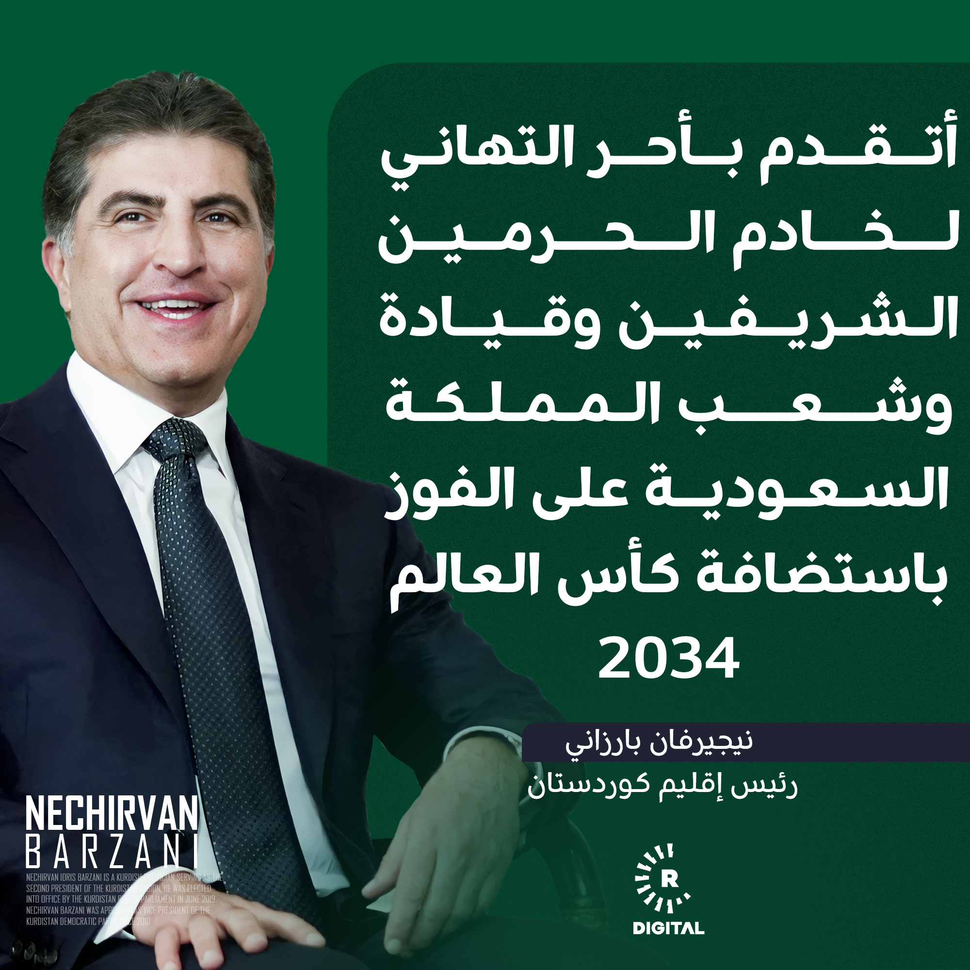 هنأ رئيس إقليم كوردستان، نيجيرفان بارزاني، العاهل السعودي، الملك سلمان بن عبد العزيز، وقيادة وشعب المملكة، بمناسبة الفوز باستضافة كأس العالم 2034.