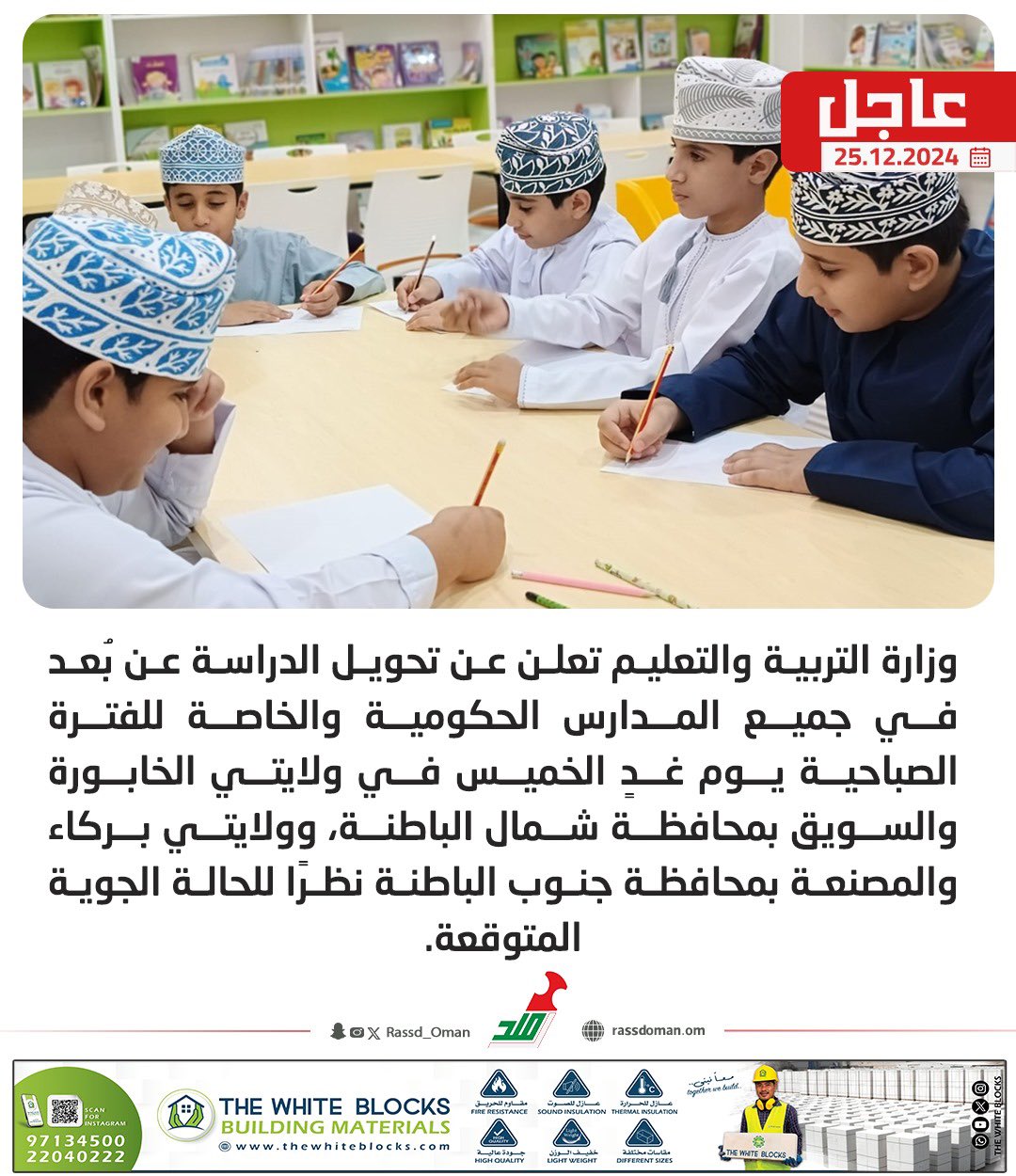 عاجل | تحويل الدراسة عن بُعد في جميع المدارس الحكومية والخاصة للفترة الصباحية يوم غدٍ الخميس في ولايتي الخابورة والسويق بمحافظة شمال الباطنة، وولايتي بركاء والمصنعة بمحافظة جنوب الباطنة نظرًا للحالة الجوية المتوقعة