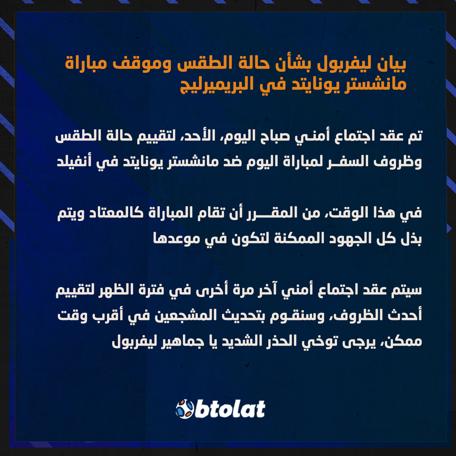 بيان من ليفربول بشأن حالة الطقس وموقف مباراة مانشستر يونايتد في البريميرليج اليوم