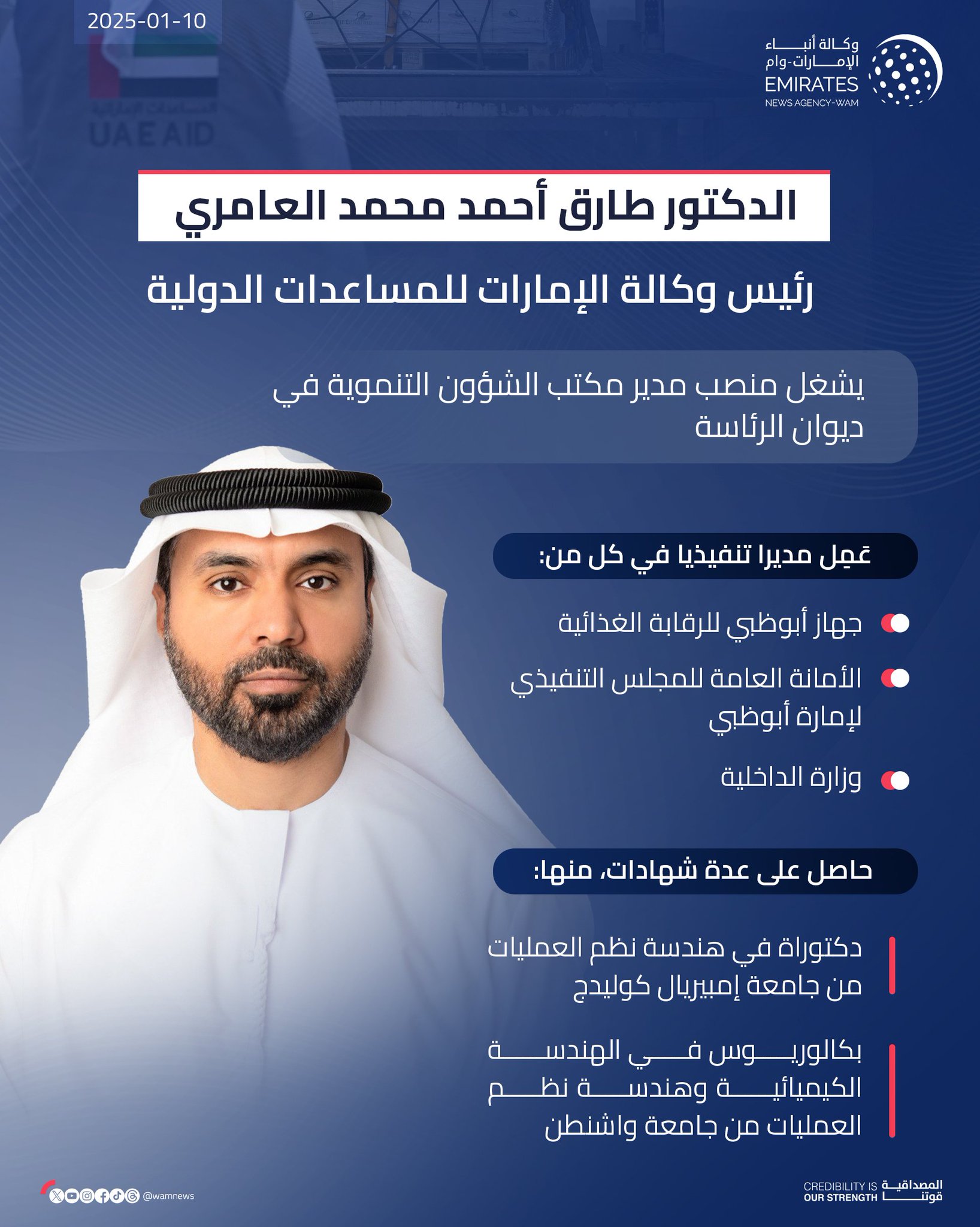 أبوظبي في 10 يناير/ وام/ أصدر صاحب السمو الشيخ محمد بن زايد آل نهيان رئيس الدولة حفظه الله ، مرسوماً اتحادياً بتعيين سعادة الدكتور طارق أحمد محمد العامري، رئيساً لوكالة الإمارات للمساعدات الدولية، وتعيين سعادة سلطان محمد سعيد الشامسي، نائباً لرئيس الوكالة.
