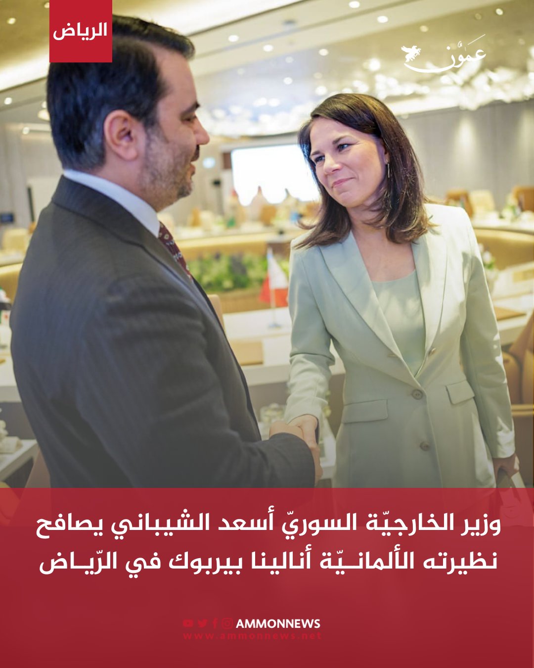 وزير الخارجية السوري اسعد الشيباني يصافح نظيرته الالمانية أنالينا بيربوك في الرياض #عمون