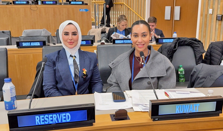 T+ | T- المستشار بإدارة الفتوى والتشريع عالية الصباح ومحام الدولة أسيل العوشز أثناء اجتماعات «أونسيترال» في مقر الأمم المتحدة