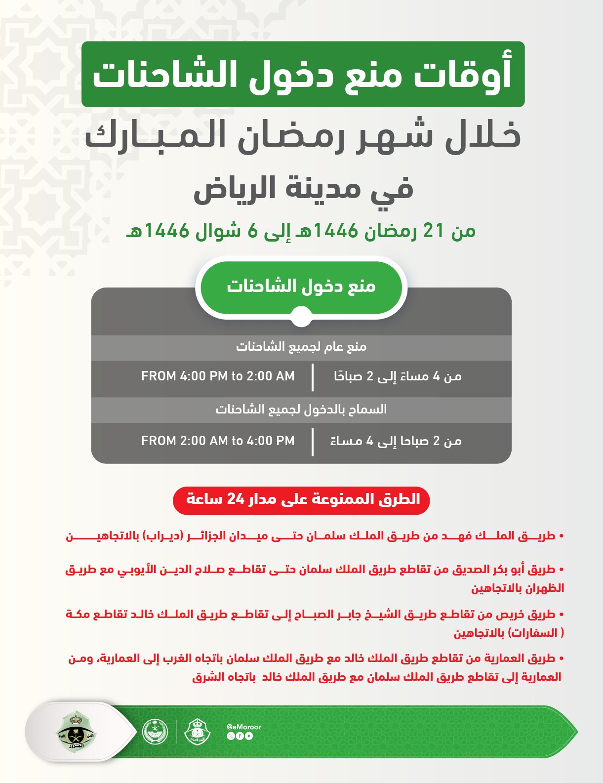 المرور يعلن أوقات منع دخول الشاحنات في مدينة الرياض خلال شهر رمضان المبارك