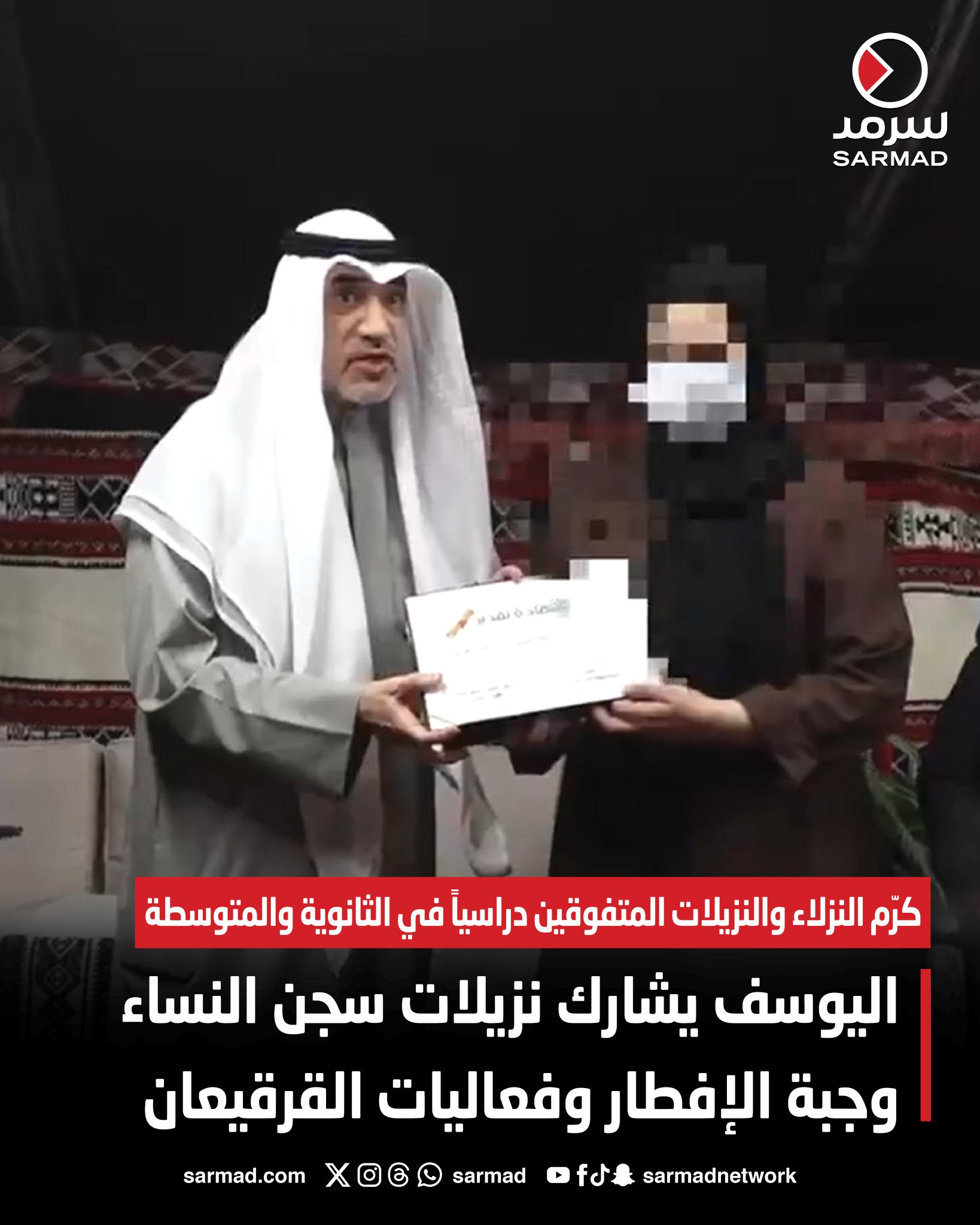 وانتقل اليوسف بعد ذلك إلى السجن العمومي للرجال وقام بجولة داخل السجن، وكرم النزلاء والنزيلات المتفوقين دراسياً في مرحلتي الثانوية والمتوسطة وأثنى على إصرارهم على طلب العلم والتفوق رغم التحديات، مشددًا على دور التعليم في تمكين الأفراد وفتح آفاق جديدة لهم بعد انقضاء محكوميتهم.