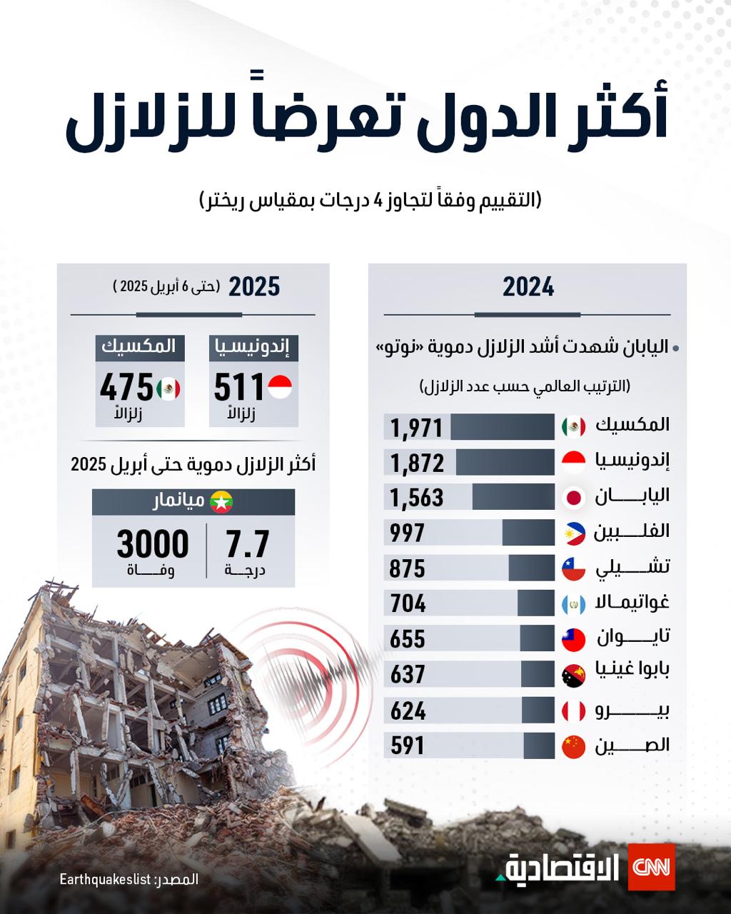 المكسيك خلال عام 2024 شهدت عدة هزات أرضية غير مسبوقة جعلتها تتصدر قائمة أكثر الدول تعرضاً للزلازل. فما هي باقي الدول؟. إليك التفاصيل بالأرقام #العالم_بلغة_الأعمال