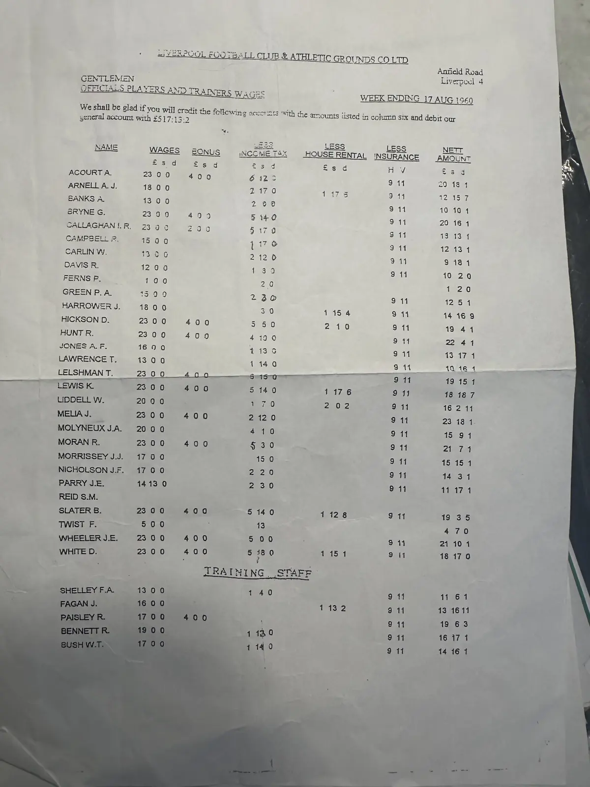 ونشر جون ألدريدغ، مهاجم ليفربول الأسبق، عبر حسابه بمنصة إكس، صورة لرواتب نجوم الريدز عام 1960 حين كان الفريق ينشط في دوري الدرجة الثانية بإنجلترا قبل 65 عاماً كاملة.