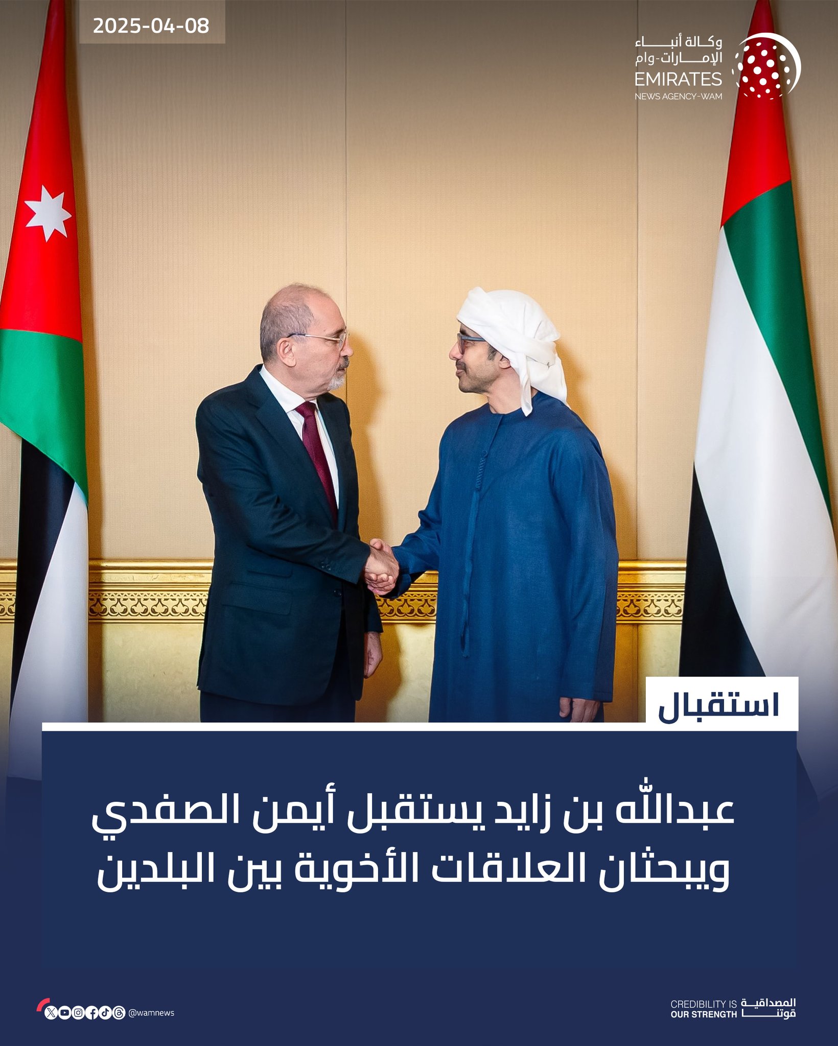 ورحب سمو الشيخ عبدالله بن زايد آل نهيان بزيارة معالي أيمن الصفدي مؤكدا أن البلدين الشقيقين يرتبطان بعلاقات أخوية وتاريخية راسخة ومتجذرة وهناك حرص مشترك على تنمية وتوسيع قاعدة.....