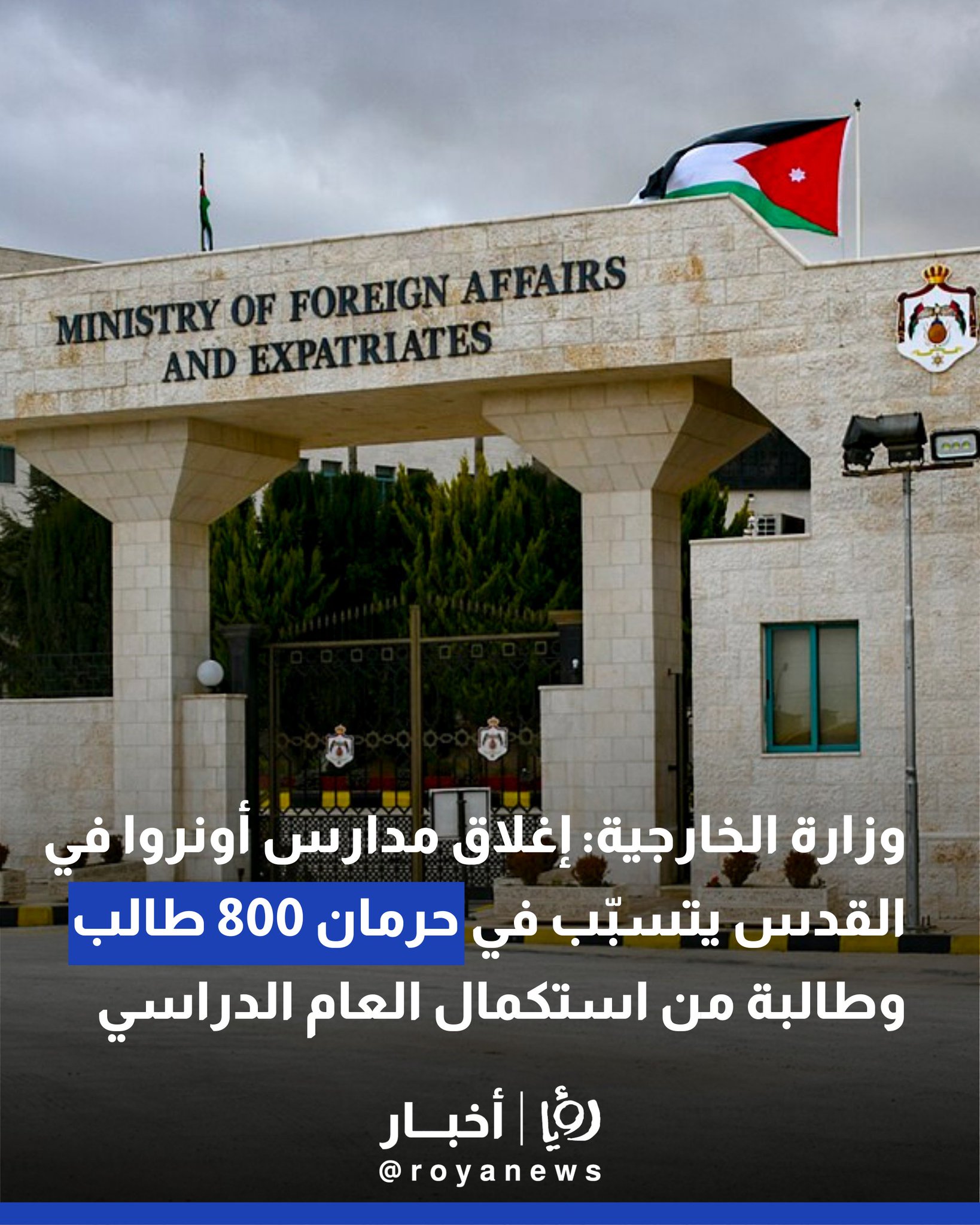 وأكّد الناطق الرسمي باسم الوزارة السفير د.سفيان القضاة رفض المملكة المطلق، واستنكارها لقرار إغلاق المدارس الذي سيتسبّب في حرمان حوالي 800 طالب وطالبة من استكمال العام الدراسي، في امتداد واضح للحملة المُمَنهجة التي تستهدف عمل (الأنروا) في القدس المحتلة .