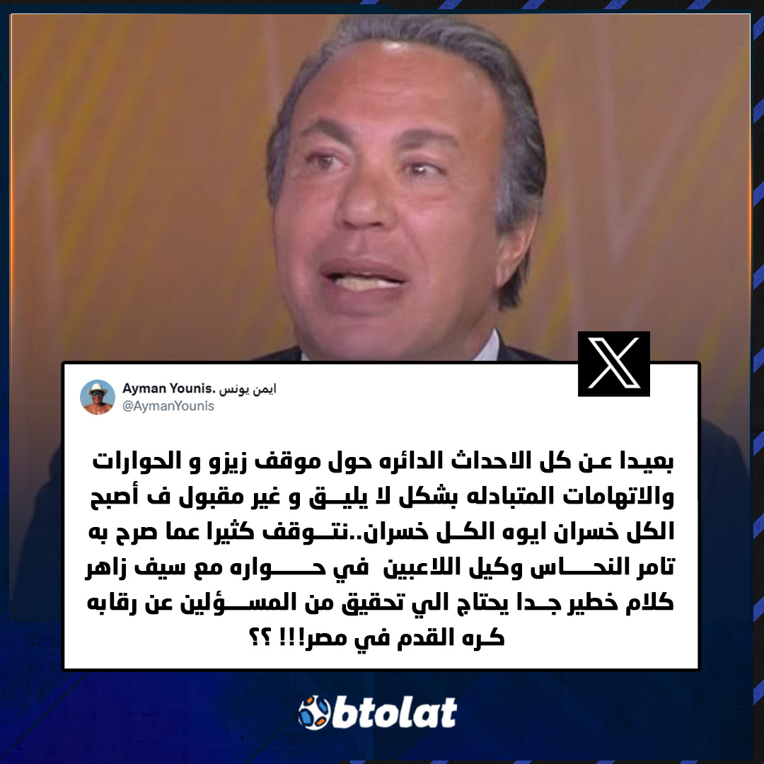 أيمن يونس عبر منصة "X". "نتوقف كثيرا عما صرح به تامر النحاس وكيل اللاعبين في حواره مع سيف زاهر..كلام خطير جدا يحتاج الي تحقيق من المسئولين"