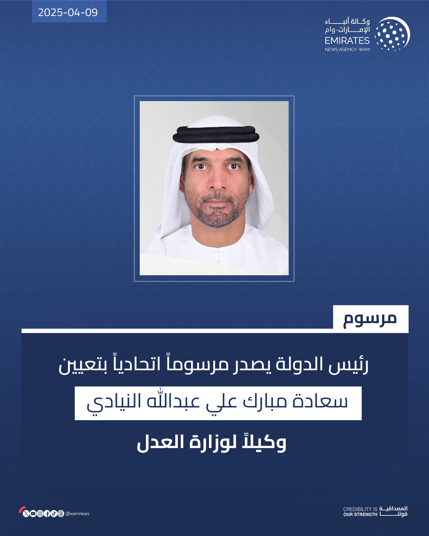رئيس الدولة يصدر مرسوماً اتحادياً بتعيين مبارك علي عبدالله النيادي وكيلاً لوزارة العدل #وام