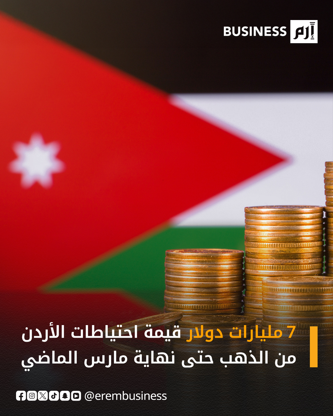 أعلن البنك المركزي الأردني أن احتياطات الممكلة من الذهب بلغ حتى نهاية مارس الماضي 7 مليارات دولار، مؤكداً أن الاحتياطات الأجنبية سجّلت رقماً قياسياً جديداً لتتجاوز 22 مليار دولار خلال الفترة نفسها.