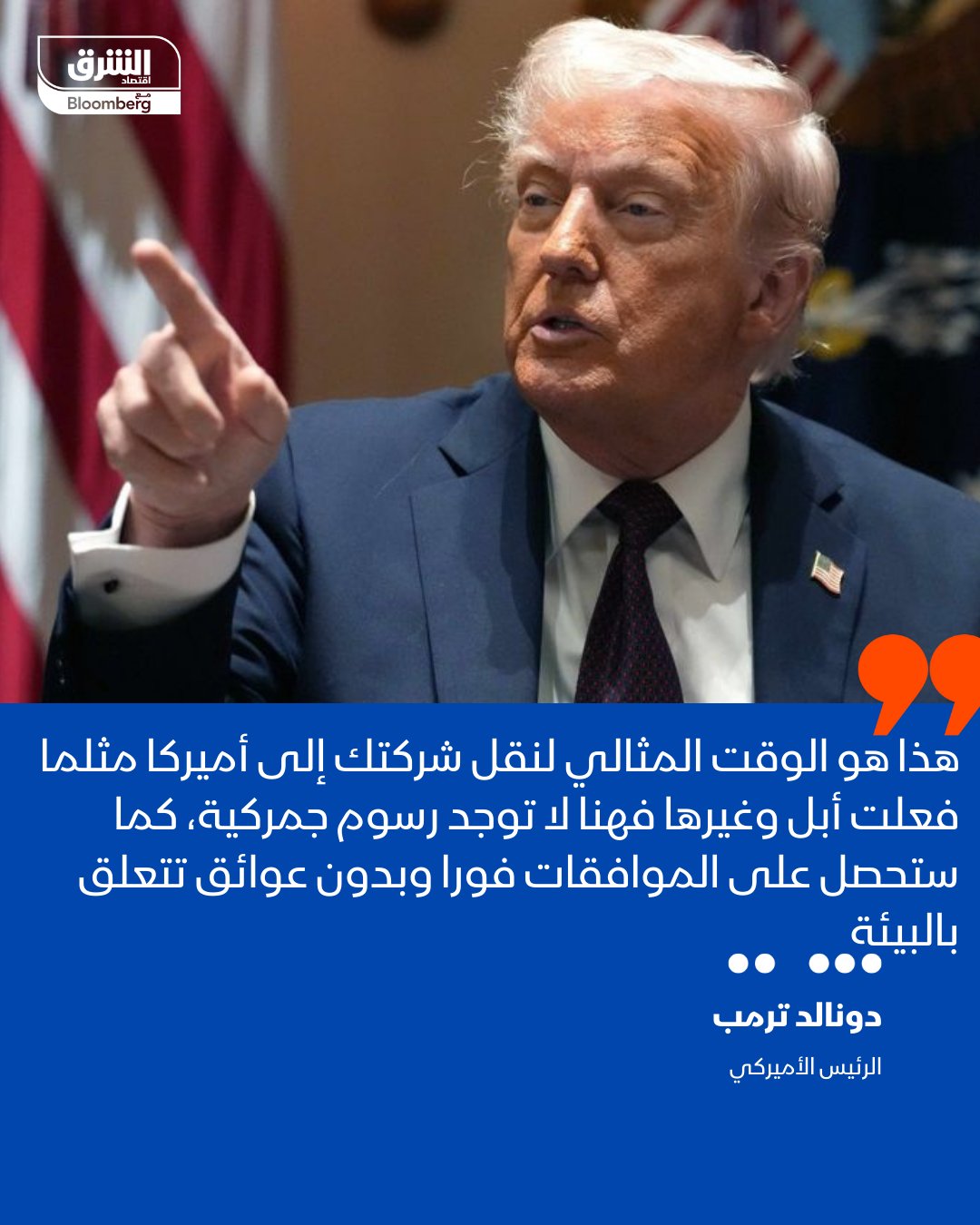 عاجل الرئيس الأميركي ترمب خلال منصة تروث: هذا هو الوقت المثالي لنقل شركتك إلى أميركا مثلما فعلت أبل وغيرها فهنا لا توجد رسوم جمركية، كما ستحصل على الموافقات فورا وبدون عوائق تتعلق بالبيئة #اقتصاد_الشرق