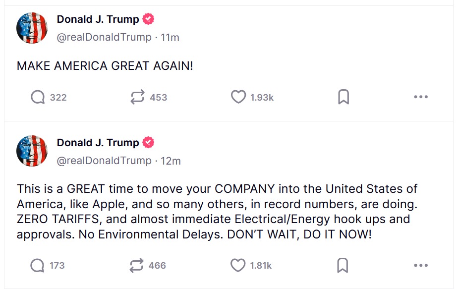 عاجل.. الرئيس الأميركي دونالد ترامب يرد على فرض الصين رسوما انتقامية على صادرات بلاده بنسبة 84% بمنشورين على منصته "تروث سوشال" قال فيهما: هذا هو الوقت الأمثل لنقل شركتك إلى الولايات المتحدة، كما تفعل أبل وغيرها بأعداد قياسية. بدون رسوم جمركية، وتوصيلات طاقة فورية.. لا تنتظر، افعلها الآن .. إجعل أميركا عظيمة مرة أخرى"