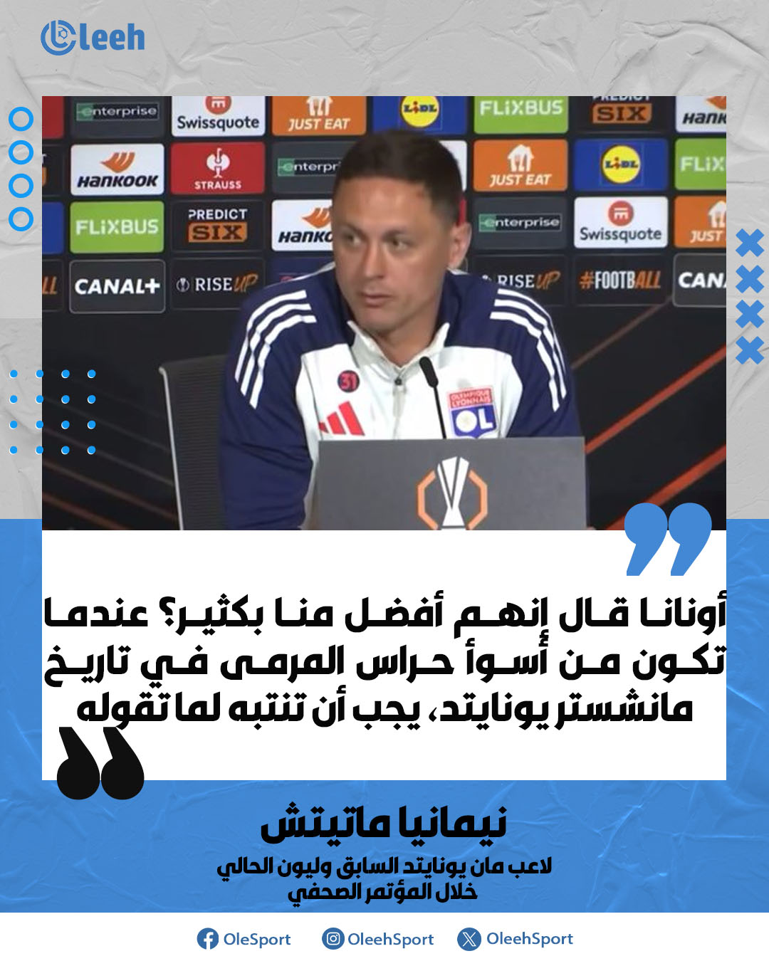 نيمانيا ماتيتش لاعب نادى أولمبيك ليون: "أونانا قال إنهم أفضل منا بكثير؟ عندما تكون من أسوأ حراس المرمى في تاريخ مانشستر يونايتد، يجب أن تنتبه لما تقوله. لو كان فان در سار، أو شمايكل، أو دي خيا من قال ذلك، لكان الأمر مقبولًا، لكن أونانا؟ إنه من بين الأسوأ". خلال المؤتمر الصحفي