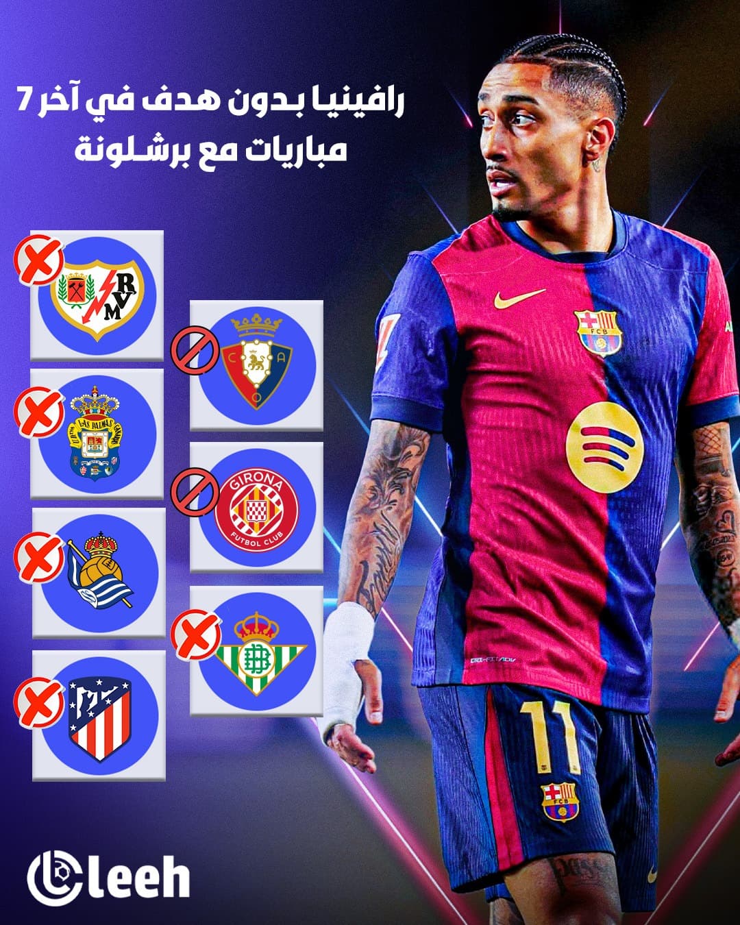 رافينيا يعاني من صيام تهديفي في آخر 7 مباريات مع برشلونة. رافينيا سجل 11 هدفًا في دوري الأبطال وهو هداف البطولة حتى الآن. لم يلعب مباراة أوساسونا وكان خارج القائمة، وأمام جيرونا لم يلعب أيضًا وكان على دكة البدلاء.. هل يعود للتهديف الليلة أمام دورتموند في بطولته المفضلة؟