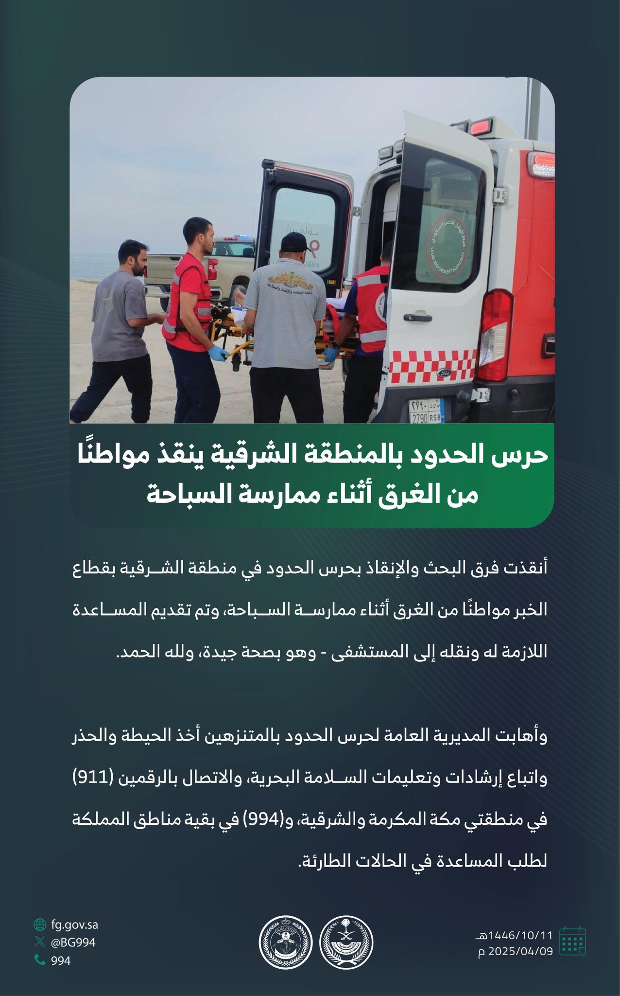 حرس الحدود بالمنطقة الشرقية ينقذ مواطنًا من الغرق أثناء ممارسة السباحة. #تم_الإنقاذ