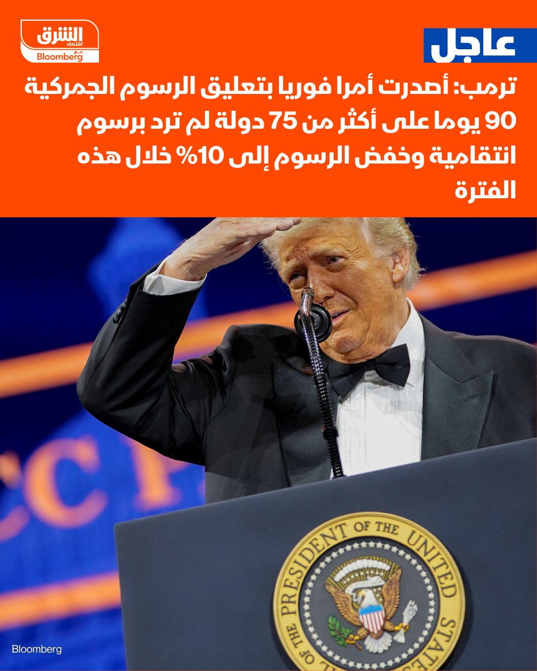 عاجل ترمب: أصدرت أمرا فوريا بتعليق الرسوم الجمركية 90 يوما على أكثر من 75 دولة لم ترد برسوم انتقامية وخفض الرسوم إلى 10% خلال هذه الفترة #اقتصاد_الشرق