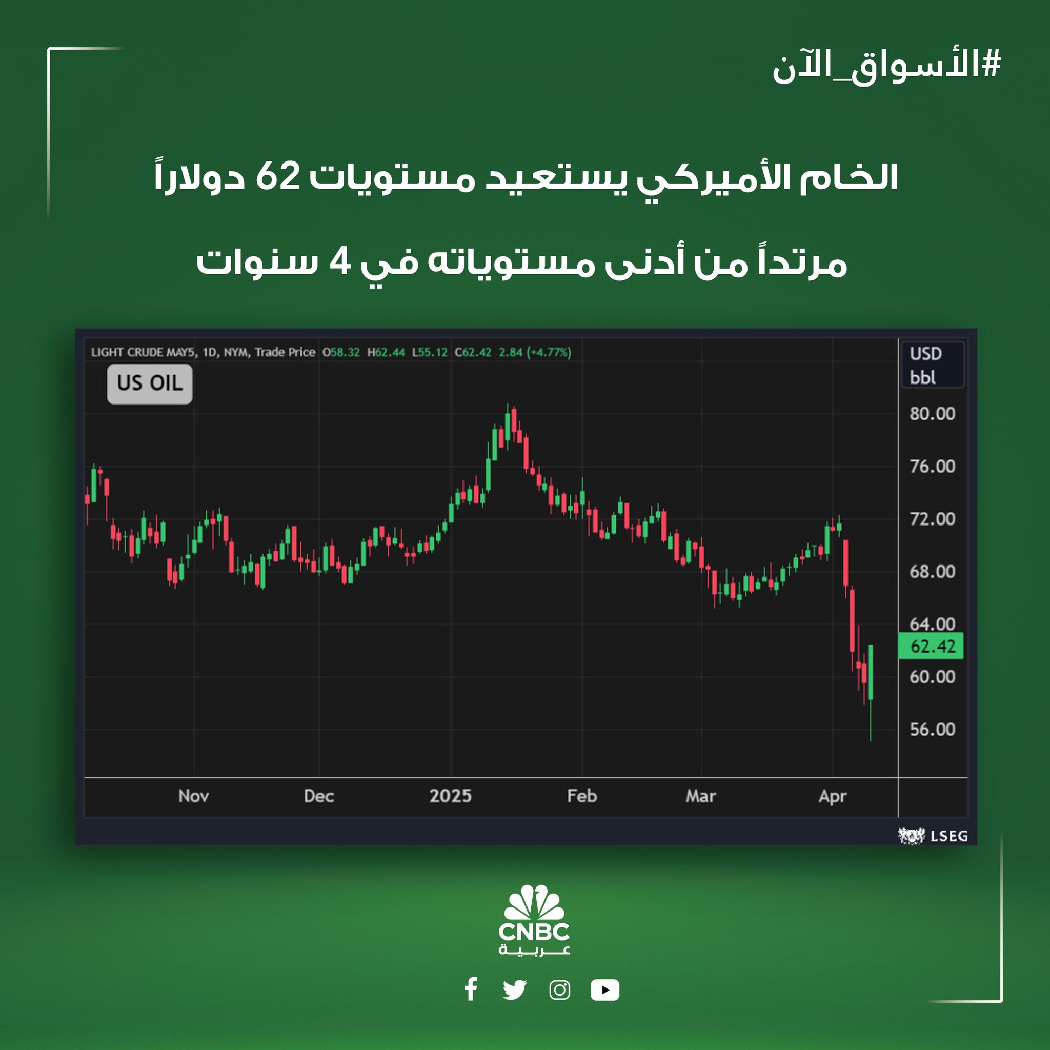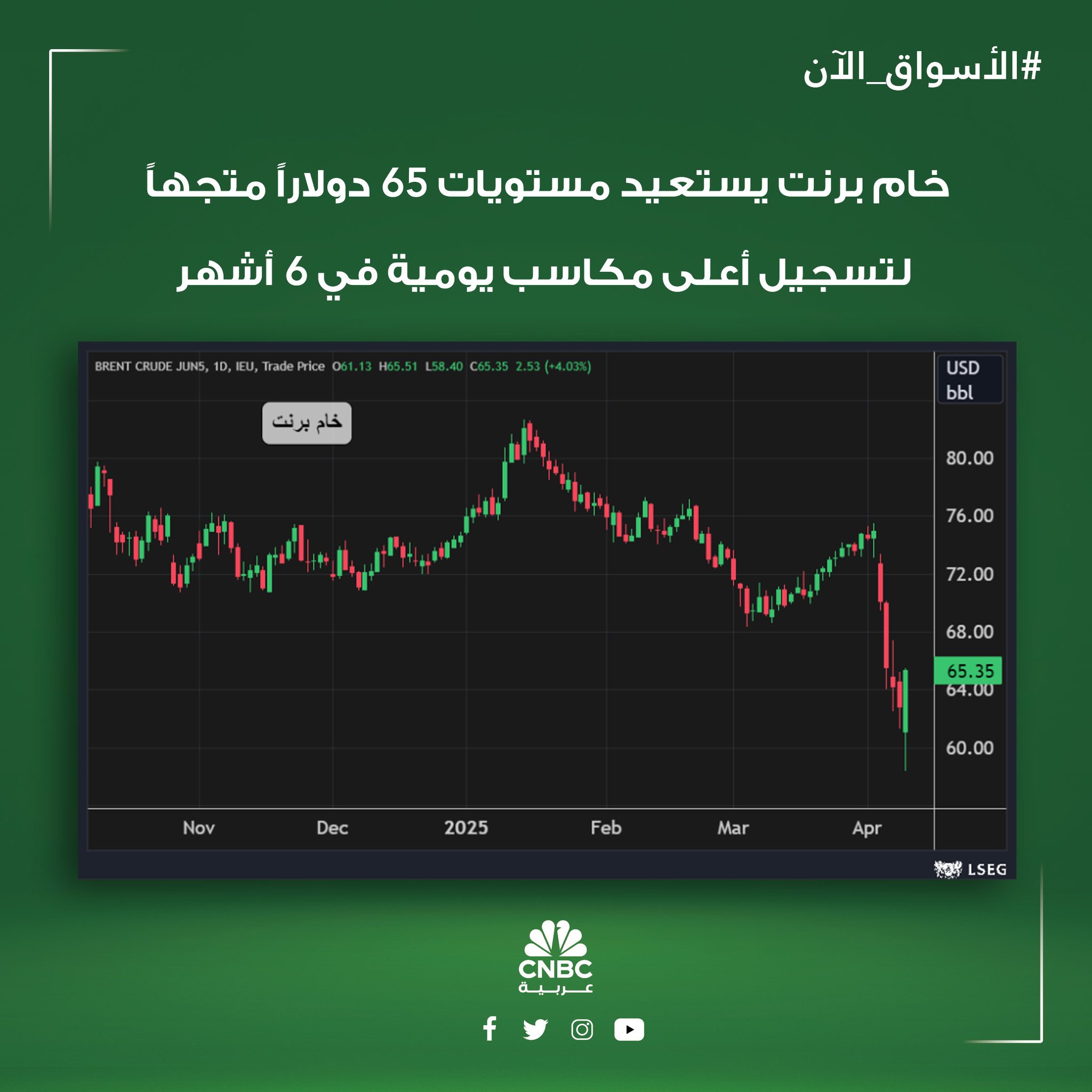 انتعاش أسعار النفط بأكثر من 4% بعد إعلان ترامب تعليق الرسوم الجمركية على جميع الدول باستثناء الصين. خام برنت يستعيد مستويات 65 دولاراً متجهاً لتسجيل أعلى مكاسب يومية في 6 أشهر. الخام الأميركي يستعيد مستويات 62 دولاراً مرتداً من أدنى مستوياته في 4 سنوات #عاجل