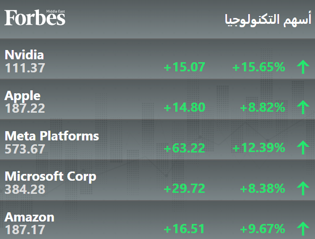 جميع مكونات مؤشر ناسداك المثقل بأسهم التكنولوجيا تسجّل مكاسب كبيرة في هذه الأثناء.. أرباح إنفيديا تفوق 16%، وأبل 10% وميتا 12% #فوربس