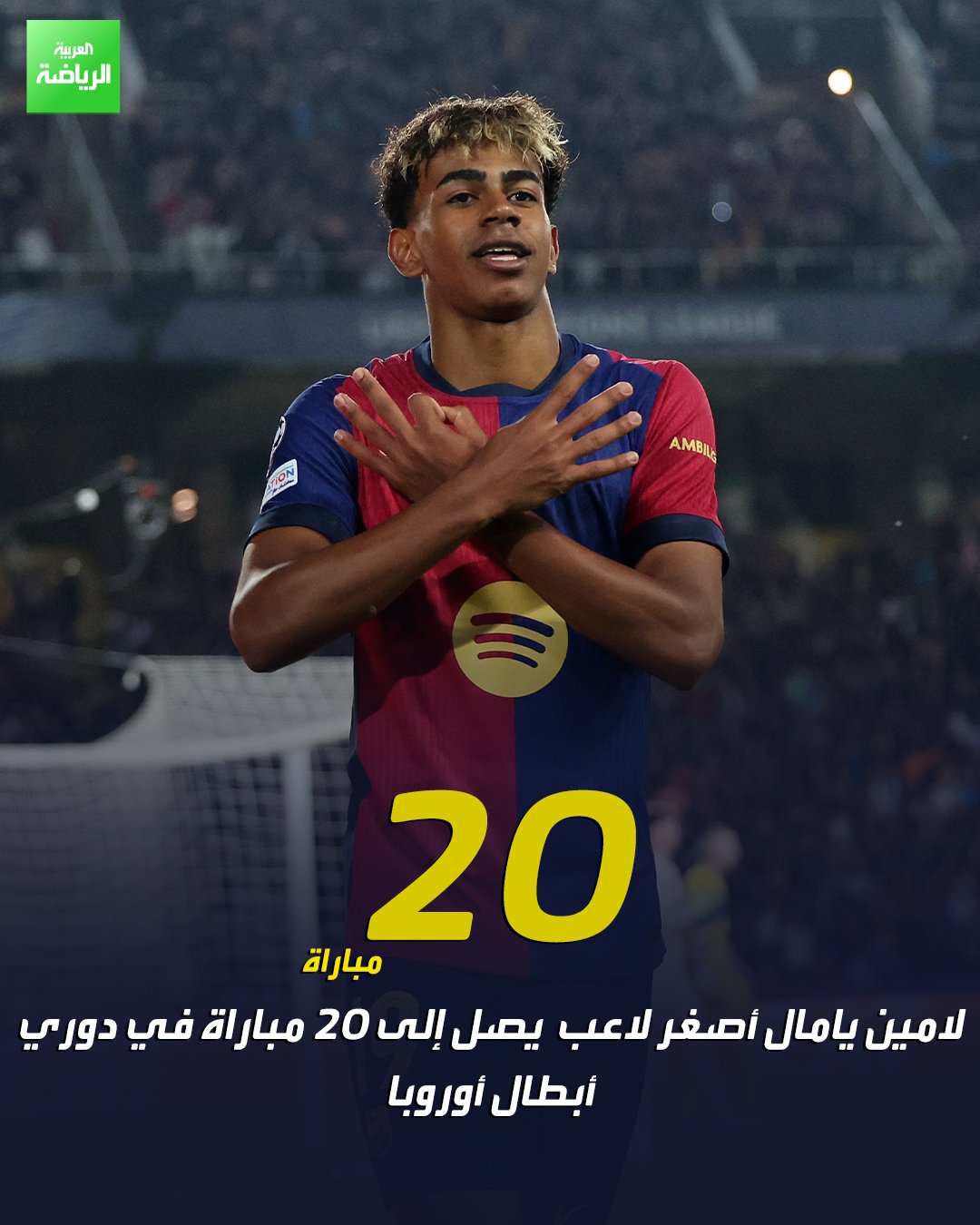 لامين يامال أصغر لاعب يصل إلى 20 مباراة في دوري أبطال أوروبا، حيث جاءت مشاركته العشرين في سن 17 عامًا و270 يومًا.. سجل هدفاً وفاز برشلونة برباعية في ليلة مميزة _رياضة