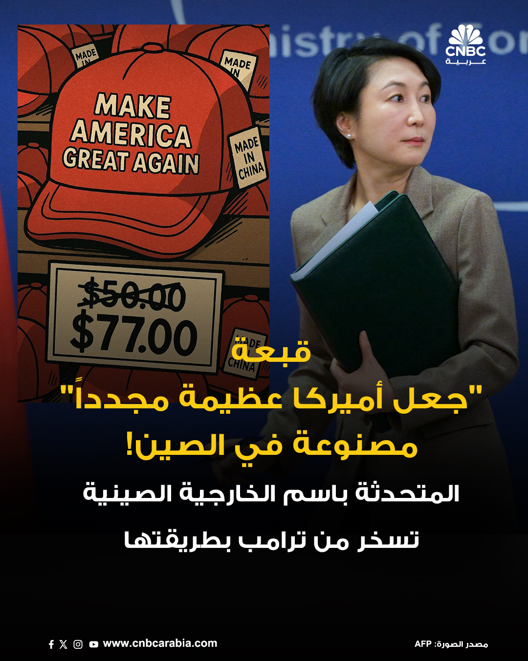 المتحدثة باسم الخارجية الصينية، ماو نينغ، تسخر من رسوم ترامب الجمركية بطريقتها الخاصة عبر إكس! نينغ قامت بنشر صورة تظهر قبعة ترامب الشهيرة التي تحمل عبارة "جعل أميركا عظيمة مجدداً" وهي تحمل ملصق "صنع في الصين" وقفز سعرها من 50 دولاراً إلى 77 دولاراً، في إشارة إلى ارتفاع سعر الضائع الصينية في أميركا بسبب التعرفات الجمركية