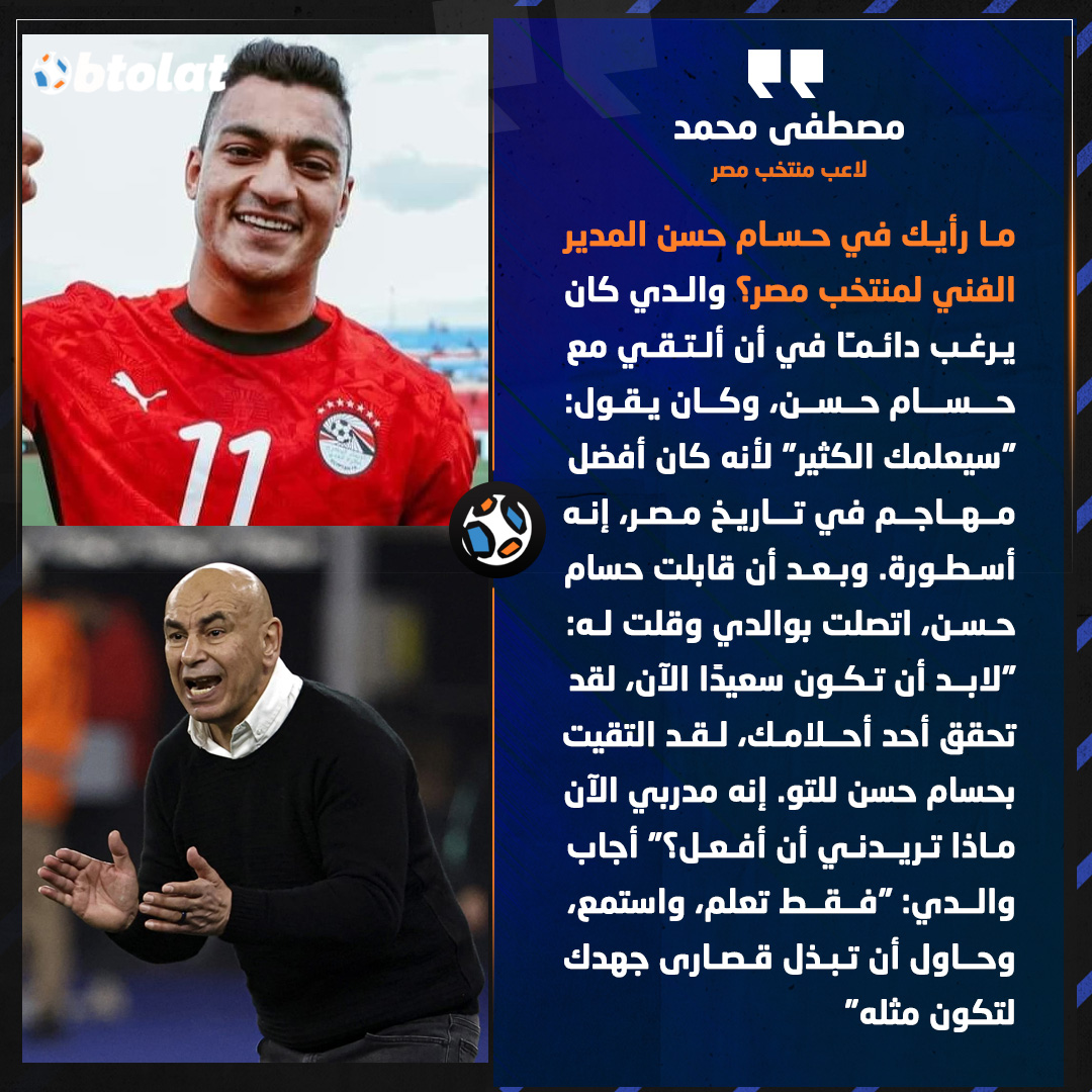 مصطفى محمد: والدي كان يرغب دائمًا في أن ألتقي مع حسام حسن. وكان يقول: "سيعلمك الكثير" لأنه كان أفضل مهاجم في تاريخ مصر، إنه أسطورة، وحاول أن تبذل قصارى جهدك لتكون مثله، لذلك، هذا ما أفعله. أحاول أن أتعلم كل شيء منه