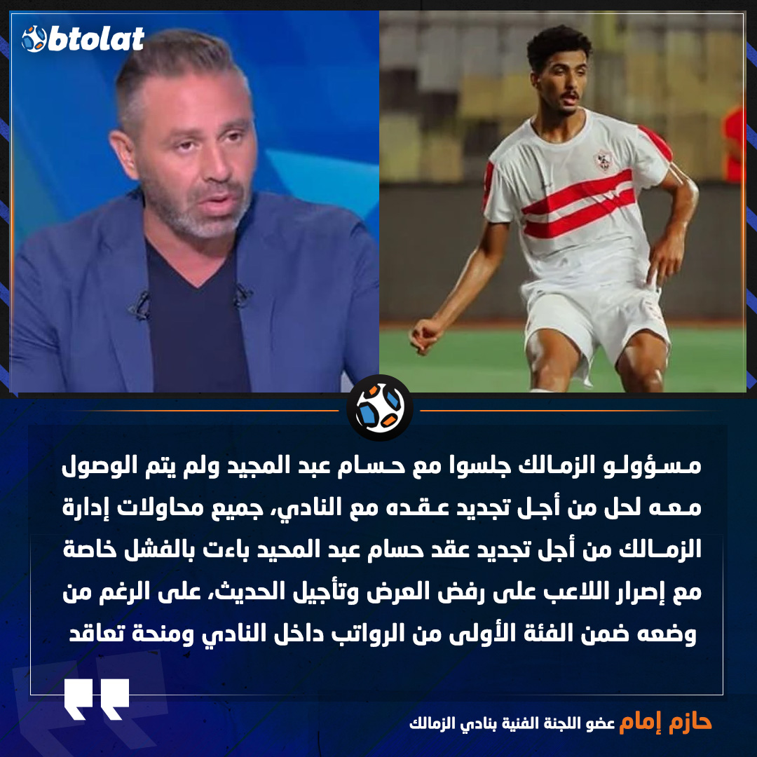 حازم إمام: مسؤولو الزمالك جلسوا مع حسام عبد المجيد ولم يتم الوصول معه لحل من أجل تجديد عقده مع النادي، جميع محاولات إدارة الزمالك من أجل تجديد عقد حسام عبد المحيد باءت بالفشل خاصة مع إصرار اللاعب على رفض العرض وتأجيل الحديث، عللى الرغم من وضعه ضمن الفئة الأولى من الرواتب داخل النادي ومنحة تعاقد