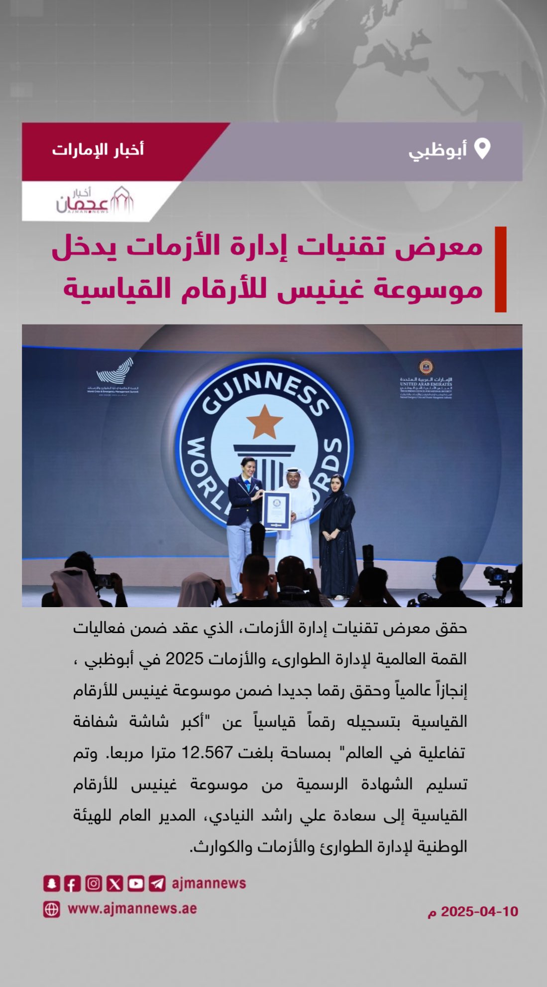 حقق معرض تقنيات إدارة الأزمات، الذي عقد ضمن فعاليات القمة العالمية لإدارة الطوارىء والأزمات 2025 في أبوظبي إنجازاً عالمياً وحقق رقما جديدا ضمن موسوعة غينيس للأرقام القياسية بتسجيله رقماً قياسياً عن "أكبر شاشة شفافة تفاعلية في العالم" بمساحة بلغت 12.567 مترا مربعا، في إنجاز تقني عالمي تقف خلفه الهيئة الوطنية لإدارة الطوارئ والأزمات والكوارث.
