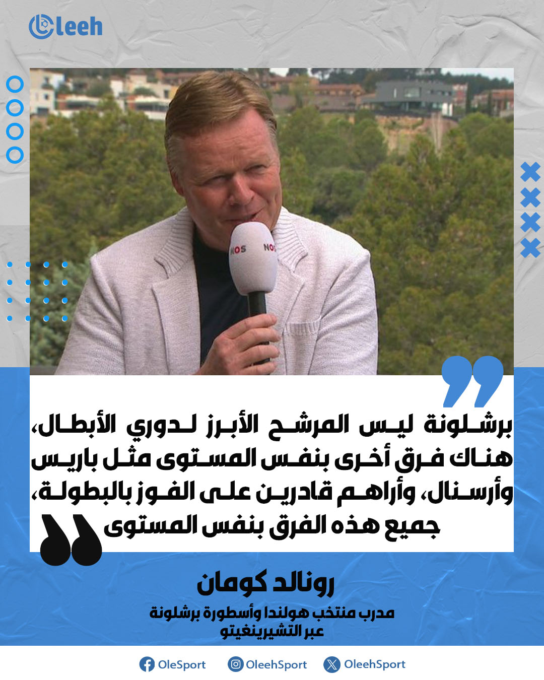رونالد كومان: "برشلونة ليس المرشح الأبرز لدوري الأبطال، هناك فرق أخرى بنفس المستوى مثل باريس وأرسنال، وأراهم قادرين على الفوز بالبطولة، جميع هذه الفرق بنفس المستوى. "ما زلت أستمتع بمشاهدتهم، لأن برشلونة بيتي، حان الوقت للاستفادة من الأجواء الجيدة في الفريق للفوز بالألقاب المهمة".. عبر elchiringuitotv