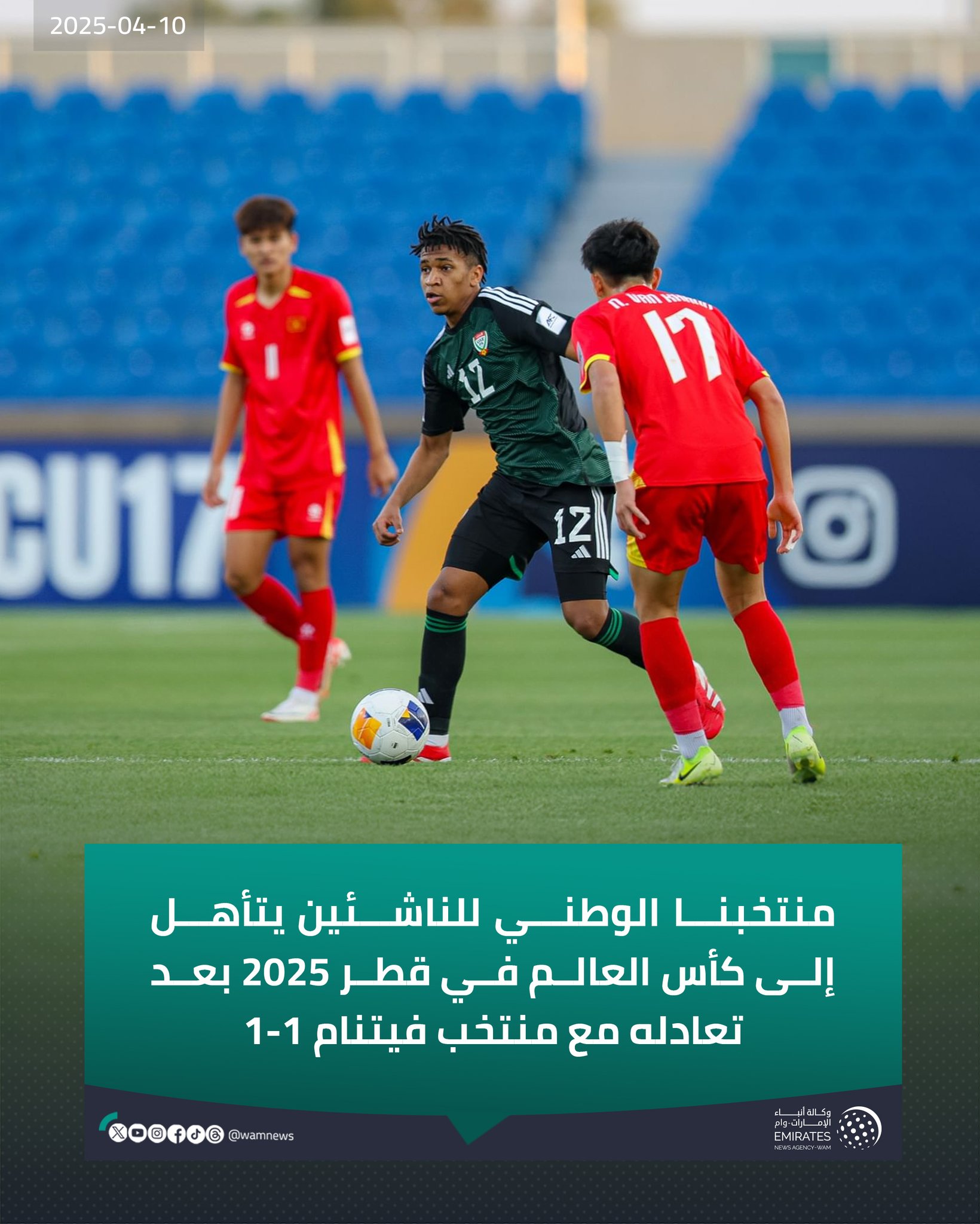 الطائف في 10 ابريل/ وام/ تأهل منتخبنا الوطني لكرة القدم كأس العالم للناشئين في قطر 2025، اثر صعوده إلى الدور ربع النهائي من كأس آسيا للناشئين تحت 17 عاما والمقامة حاليا في الطائف بالمملكة العربية السعودية.