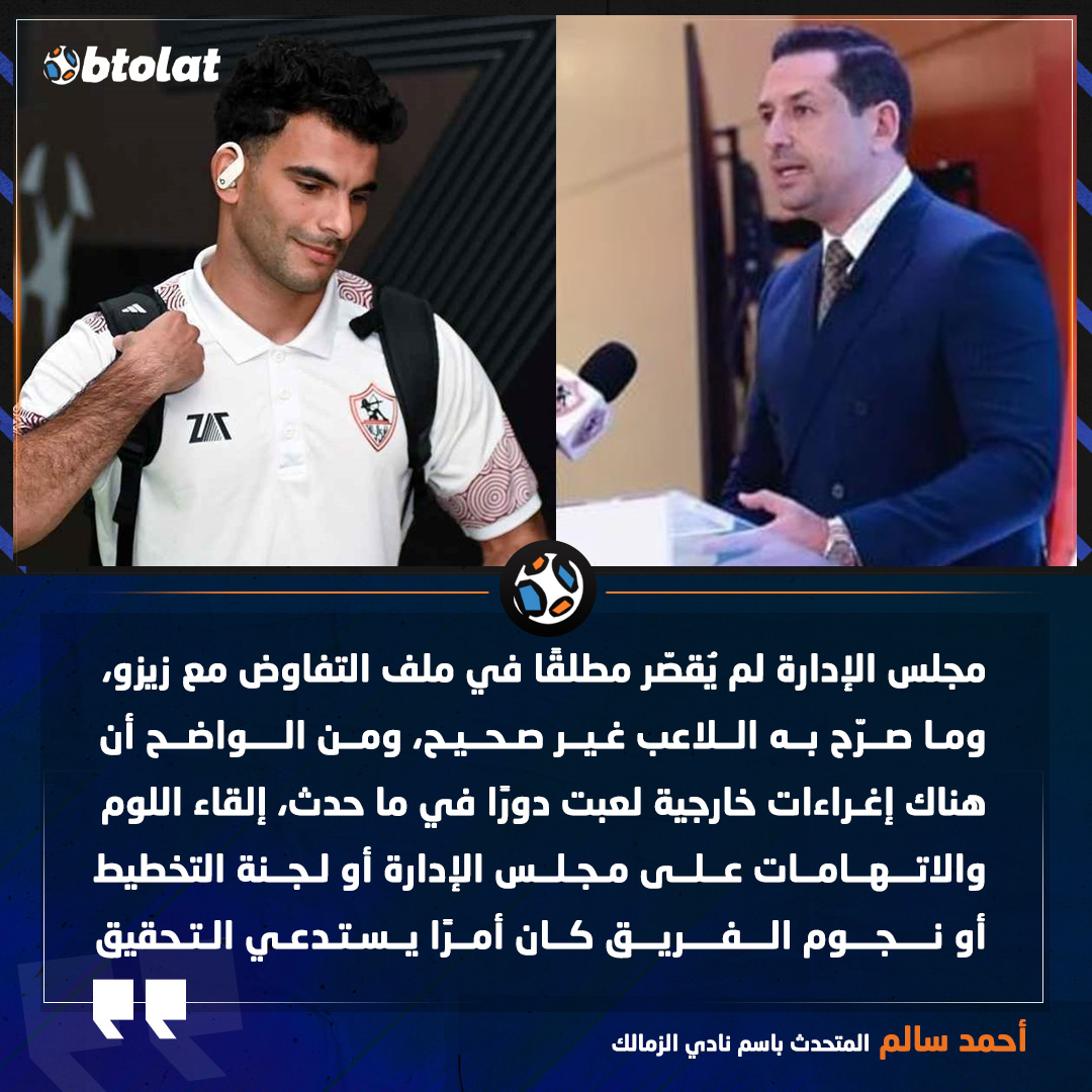 أحمد سالم. مجلس الإدارة لم يُقصّر مطلقًا في ملف التفاوض مع زيزو، وما صرّح به اللاعب غير صحيح، ومن الواضح أن هناك إغراءات خارجية لعبت دورًا في ما حدث، إلقاء اللوم والاتهامات على مجلس الإدارة أو لجنة التخطيط أو نجوم الفريق كان أمرًا يستدعي التحقيق
