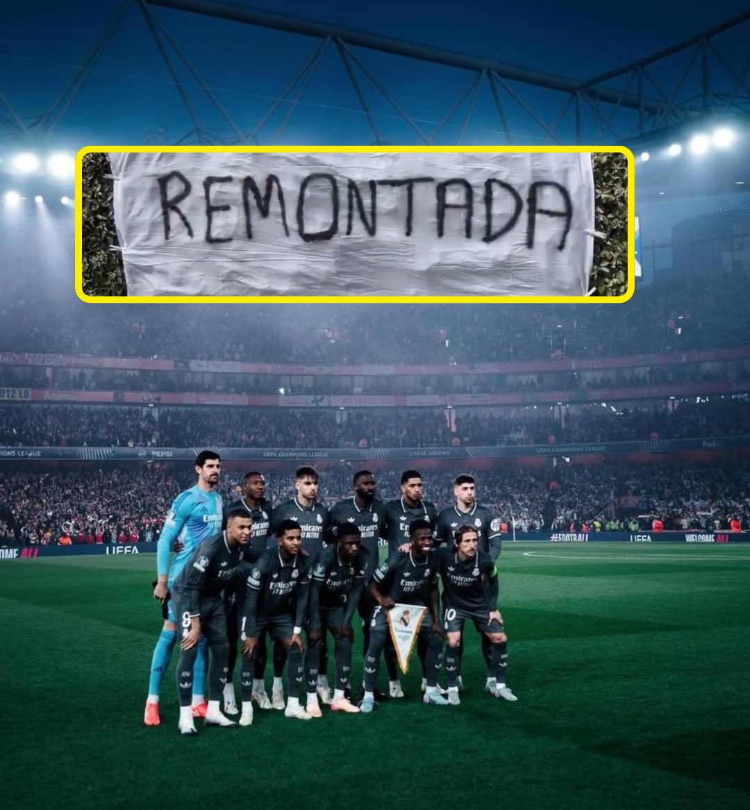 جماهير ريال مدريد ترفع لافتة "ريمونتادا" أمام بوابة الفالديبيباس ليراها اللاعبون يوميًا خلال مغادرتهم التدريبات حتى موعد مباراة أرسنال