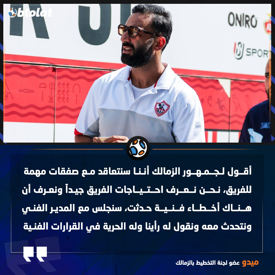 ميدو. أقول لجمهور الزمالك أننا سنتعاقد مع صفقات مهمة للفريق، نحن نعرف احتياجات الفريق جيداً ونعرف أن هناك أخطاء فنية حدثت، سنجلس مع المدير الفني ونتحدث معه ونقول له رأينا وله الحرية في القرارات الفنية