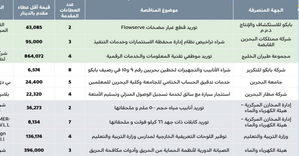 أما شركة ممتلكات البحرين القابضة فحصلت على مناقصة لشراء تراخيص نظام إدارة محفظة الاستثمارات وخدمات التنفيذ، وتقدمت لها 3 عطاءات، وكان العطاء الأقل بقيمة 95 ألف دينار مقدمًا من شركة توقيت.