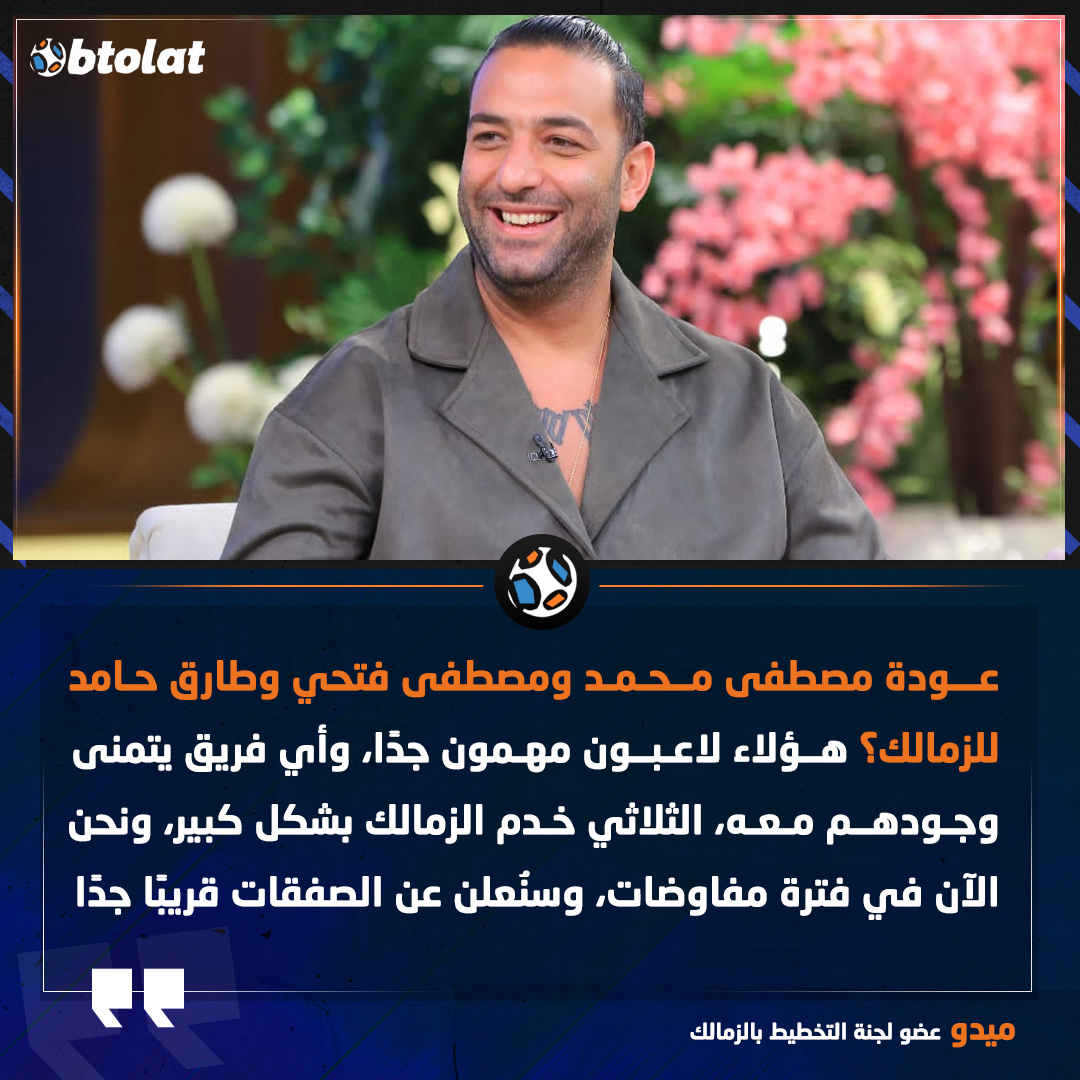 ميدو عن عودة مصطفى محمد ومصطفى فتحي وطارق حامد للزمالك. هؤلاء لاعبون مهمون جدًا، وأي فريق يتمنى وجودهم معه، الثلاثي خدم الزمالك بشكل كبير، ونحن الآن في فترة مفاوضات، وسنُعلن عن الصفقات قريبًا جدًا