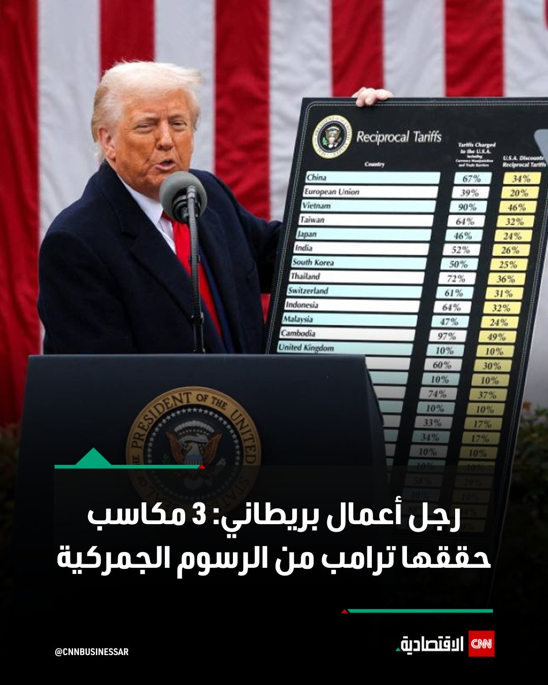 وأوضح رجل الأعمال «في 2 أبريل نيسان 2025، أعلن ترامب عن فرض رسوم جمركية أساسية بنسبة 10 في المئة على جميع الواردات، مع فرض رسوم جمركية متبادلة تصل إلى 60 في المئة على 57 دولة تفرض بالفعل رسوماً جمركية على السلع الأميركية»، معقباً «هذا رفع الرسوم الجمركية الأميركية من 2 في المئة إلى 24 في المئة على دولة مثل بريطانيا وهو أعلى مستوى لها منذ قرن».